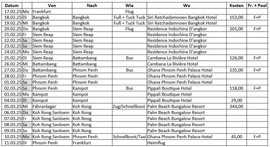 Von Kampot aus fuhren wir mit dem Zug weiter nach Sihanoukville, und von dort ging es direkt weiter auf die Insel Koh Rong, wo wir weitere 5 Tage verbrachten. Den Abschluss der Reise bildeten die Fahrt und eine Übernachtung in Phnom Penh. Von hier aus flogen wir mit einem Zwischenstopp in Bangkok wieder zurück nach Hause