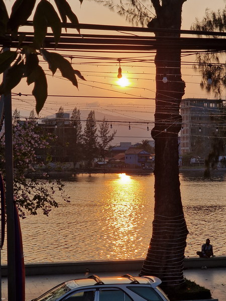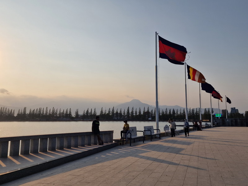Erst kurz vor Sonnenuntergang machten wir uns zu Fuß auf den Weg ins Städtchen, entlang der ruhigen Uferpromenade, wo das Leben gemächlich dahinfloss – ganz im Kampot-Stil.
