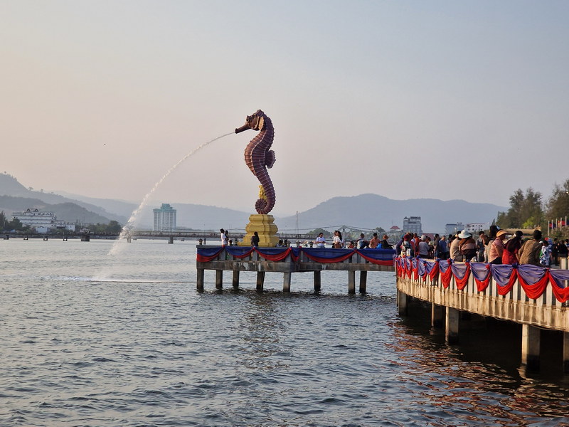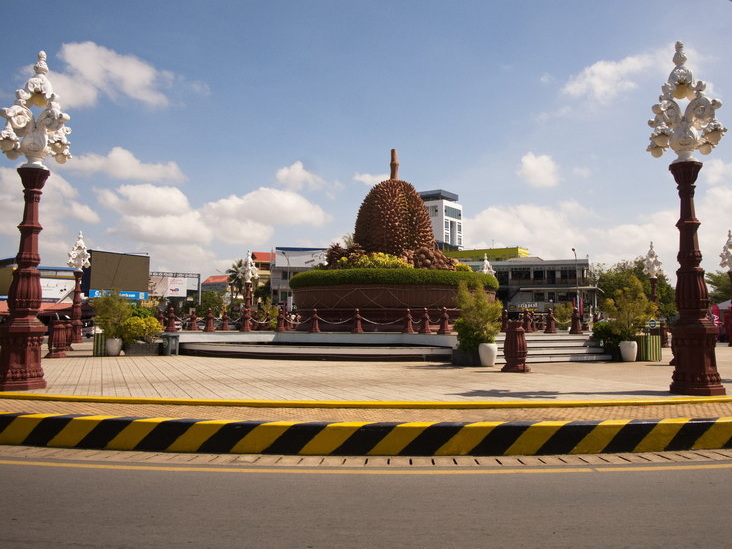 Die große Durian-Statue im Kreisverkehr ist eine Hommage an die Blütezeit der Durian-Produktion in Kampot in den 1940er Jahren, die in der Region inzwischen wieder angebaut wird.