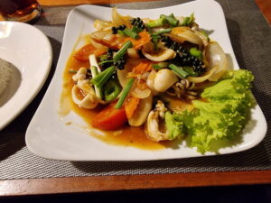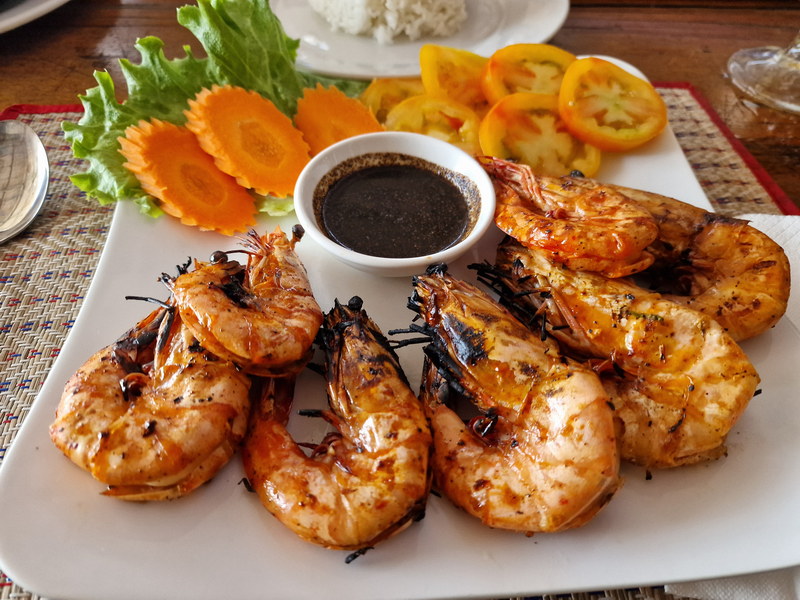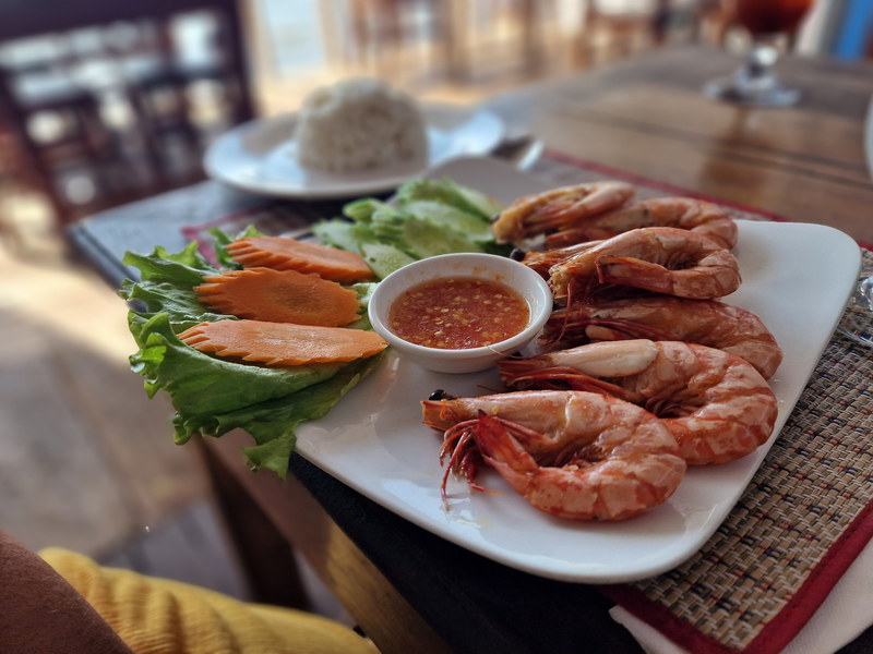 In Kep angekommen, lotste uns Dara direkt in ein Restaurant. Zunächst waren wir etwas enttäuscht – eigentlich hatten wir uns auf eine der typischen Garküchen gefreut, um die Meerestiere ganz frisch vom Grill oder aus dem Topf zu bekommen. Doch Dara versicherte uns, dass auch hier alles frisch sei.