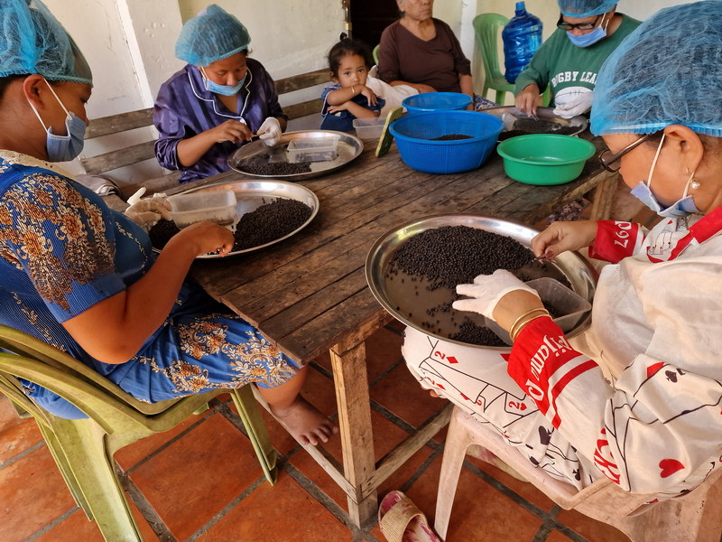 Neben Pfeffer wachsen hier auch noch verschiedene Chillischoten und einige Obstbäume. Wer mich kennt, weiß dass es mir insbesondere die Mango-Bäume angetan haben. Wie schön wäre es, wenn Mangos auch bei uns wachsen würden. Vor allem die leckeren gelben gönnten wir uns hier jeden Tag. Am Ende unseres Streifzugs durch die Plantage kamen wir zu einer Gruppe Frauen die flink die Pfefferkörner nach Qualität sortierten.