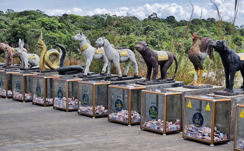 Die Menagerie rechts der Statue symbolisieren die 12 chinesichen Tierkreiszeichen. Wahrscheinlich werden die gesammelten Gelder für die Instandhaltung des Monuments, religiöse Zeremonien oder andere Zwecke im Zusammenhang mit dem Schrein verwendet.