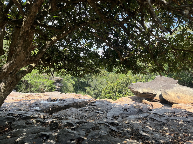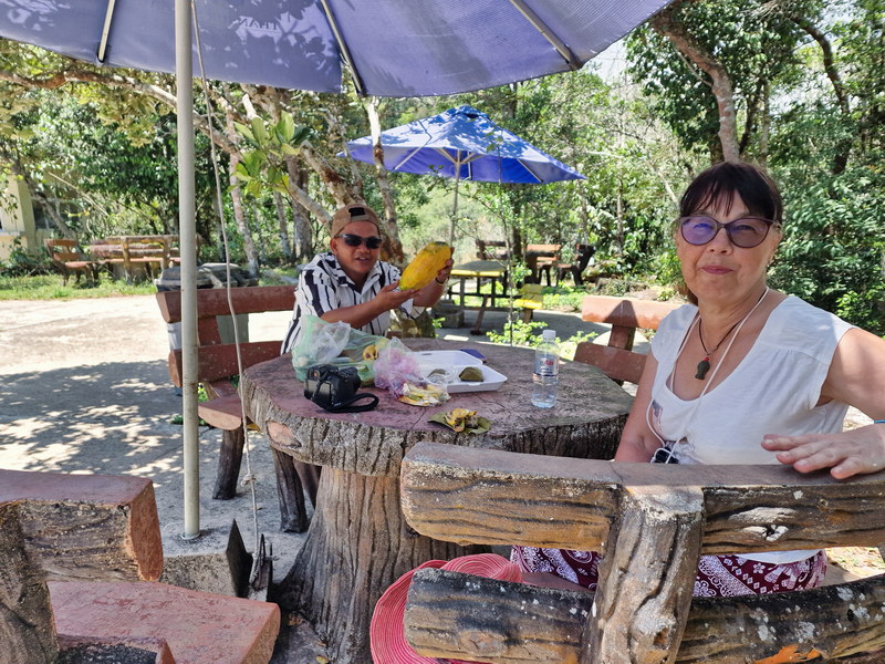 So langsam wurde es Zeit für eine kleine Mittagspause. Dafür hatte Dara ein paar kambodschanische Leckereien eingekauft. Einen schönen Platz fanden wir oberhalb des in der Trockenzeit ausgetrockneten