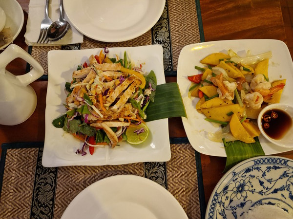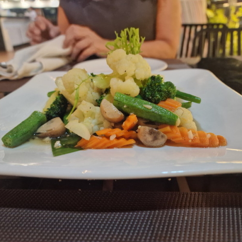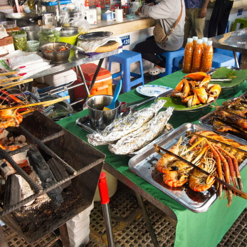 Zum Abendessen ließen wir uns mit einem Grab-TukTuk zum Nachtmarkt fahren. Der Markt war durchaus interessant und ganz anders als die bisherigen, doch die angebotenen Waren unterschieden sich kaum von dem, was wir schon gesehen hatten — unser Portemonnaie blieb also auch diesmal zu. Auch essen mochten wir hier nicht, es war uns einfach zu fleischlastig. Also nahmen wir das nächste TukTuk und ließen uns an die Strandpromenade bringen, zu einem zuvor ausgesuchten Restaurant. Eine sehr gute Entscheidung!