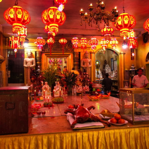 Vor uns lag tatsächlich der Tempel: ein friedlicher Ort, umgeben von kleineren Schreinen und Figuren, liebevoll geschmückt mit Räucherstäbchen, Blumen und Kerzen, die Gläubige dargebracht hatten. Wir ließen den Blick schweifen – über die bunten Opfergaben und die stillen Mönche. Die Stadt tief unter uns geriet in Vergessenheit.