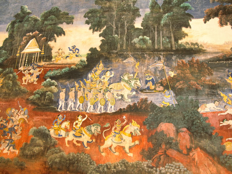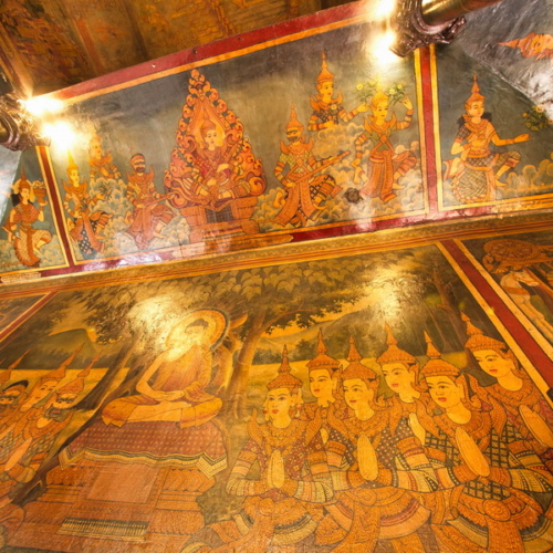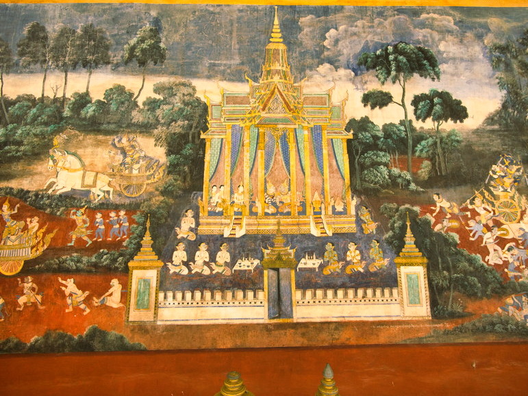 Die Farben sind zwar teils schon verblasst und an vielen Stellen nagt der Zahn der Zeit, doch die Detailfülle ist immer noch faszinierend. Götter, Dämonen, Schlachten und mystische Wesen tummeln sich in kunstvoll gemalten Szenen, die einen tiefen Einblick in die kambodschanische Mythologie geben.