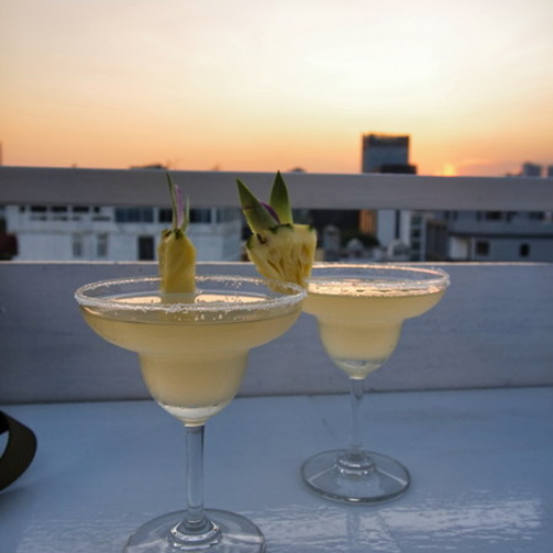Kurz vor 18:00 (noch innehalb der Happy Hour) trafen wir auf der Dachterrasse unseres Hotels ein. Gerade rechtzeitig für einen schönen Sonnenuntergang.