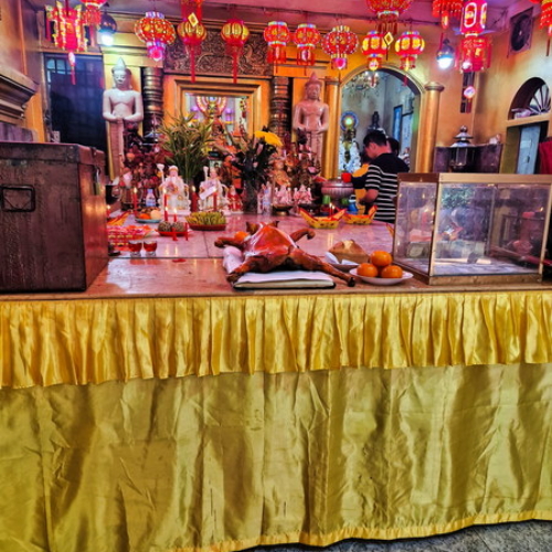 Bereits der Haupttempel mit seiner breiten roten Treppe, den goldenen Löwenfiguren und den kunstvoll verzierten Giebeln beeindruckte uns. Wir konnten den Haupttempel sogar betreten. Im Inneren erwartete uns ein großzügig gestalteter Raum mit kunstvollen Wandmalereien, einer großen Buddha-Statue und auffallend vielen kleineren Altären.