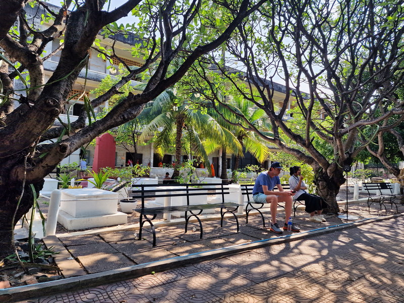Sobald man das Gelände betritt, sieht man im Innenhof, dem ehemaligen Pausenhof, symbolische Grabmäler für die letzten Opfer, die in Tuol Sleng ums Leben kamen. Neben den Gräbern stehen im Schatten exotischer Bäume Bänke, die zum Innehalten und Ausruhen einladen. Viele Guides nutzen diese Bänke, um ihren Gruppen die Gräueltaten der Roten Khmer näherzubringen.