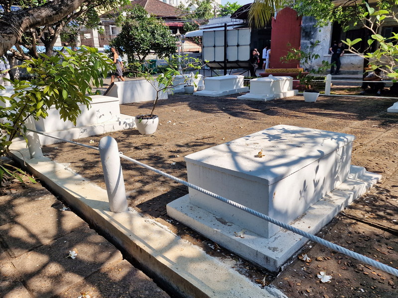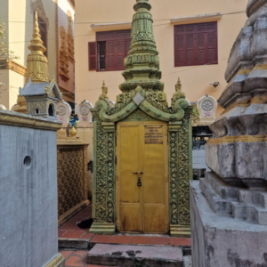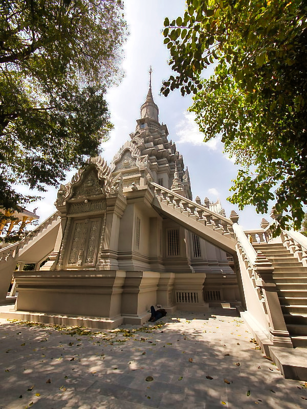 Im hinteren Teil der Anlage entdeckten wir die Stupa von König Norodom (1834–1904), dem Großvater des heutigen Königs Norodom Sihamoni. Sie ist schlicht, aber eindrucksvoll gestaltet und steht etwas abseits vom Hauptweg. Umgeben von weiteren kleineren Stupas und einem beeindruckenden Hain aus Kanonenbäumen, wirkt sie wie ein stiller Ort des Gedenkens – ein architektonisches Zeugnis der kambodschanischen Königsgeschichte.