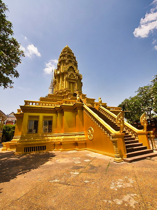 Unser Tuk Tuk schaukelte uns gemütlich zu unserem nächsten Besichtigungspunkt. Dieser war nicht, wie wir gehofft hatten, eines der Mahnmale der Roten Khmer, sondern das wichtigste Heiligtum und Wahrzeichen von Phnom Penh, dem