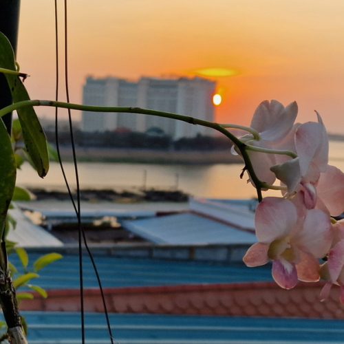 Da wir gestern Nachmittag bereits mit Mr. Chang abgesprochen hatten, dass wir heute kein TukTuk brauchen würden — die wenigen Sehenswürdigkeiten wollten wir zu Fuß erkunden — waren wir diesmal als Fußgänger unterwegs. Bevor wir losliefen, genossen wir noch vor dem Frühstück den Sonnenaufgang von der Dachterrasse unseres Hotels. Was für ein großartiger Start in den Tag!