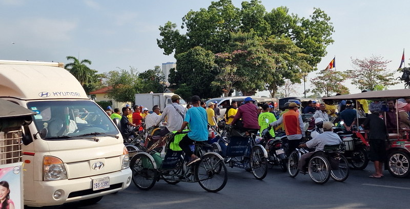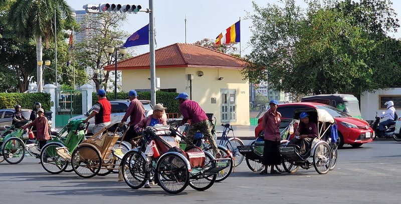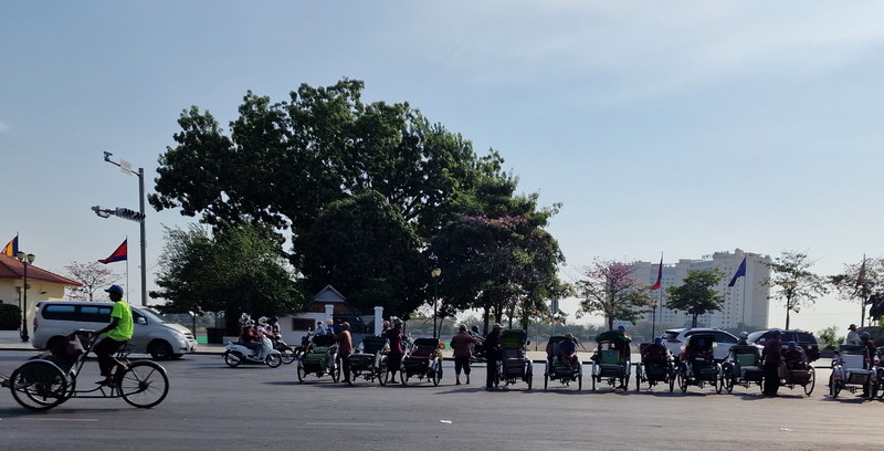Gegen 8:30 Uhr machten wir uns auf den Weg. Der eigentlich geplante Wat Ounalom Tempel war leider noch geschlossen, also gingen wir direkt weiter zum Königspalast. Auf dem Weg dorthin konnten wir beobachten, wie sich die Rikscha-Fahrer für ihre ersten Touren des Tages formierten