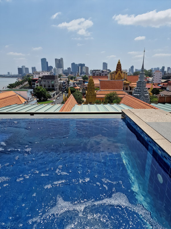 Anschließend faulenzten wir etwas am Pool, bevor wir die letzte Happy Hour auf unserer schönen Hotelterrasse mit Blick auf den Mekong genossen.