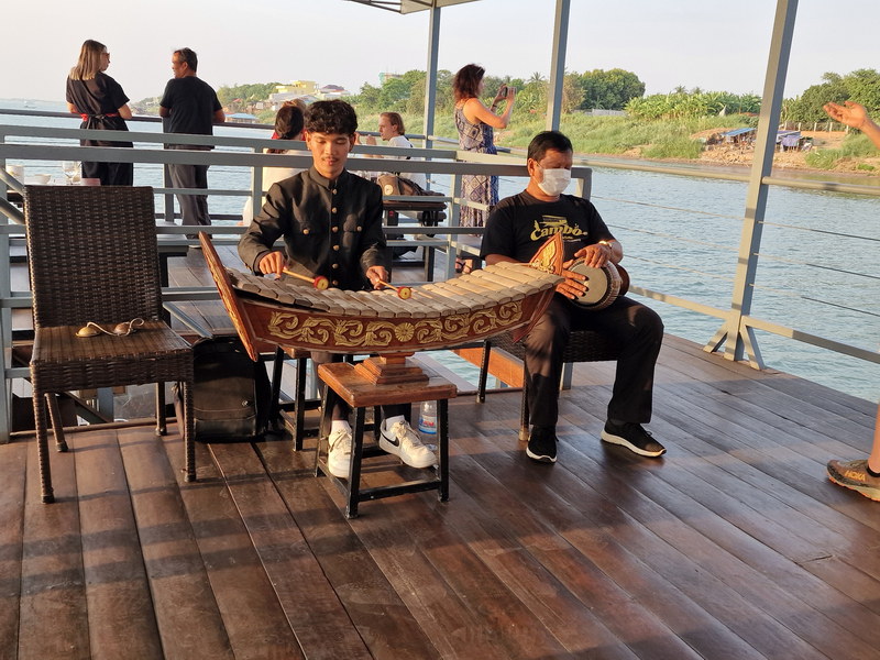 Zu dieser Szenerie passte perfekt die traditionelle kambodschanische Musik die unsere kleine Band am Bord spielte. Die sanften Klänge passten perfekt zur ruhigen Fahrt und der goldenen Stimmung, die sich über Wasser und Stadt legte.