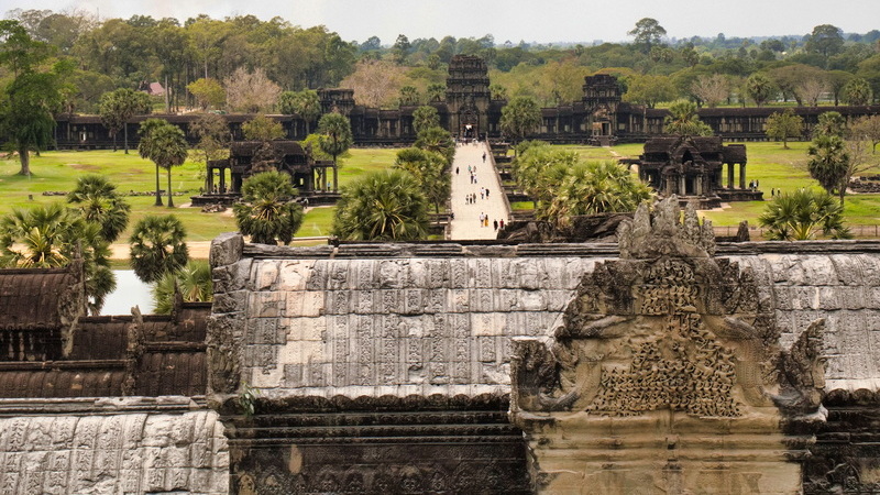 Vom äußeren Eingangstor aus führt zunächst ein breiter, etwa 190 Meter langer Damm über den Wassergraben. Anschließend geht es weiter über einen geraden Steinweg, der sich durch den weitläufigen äußeren Bereich des Tempelkomplexes zieht und schließlich zur inneren Tempelanlage führt.