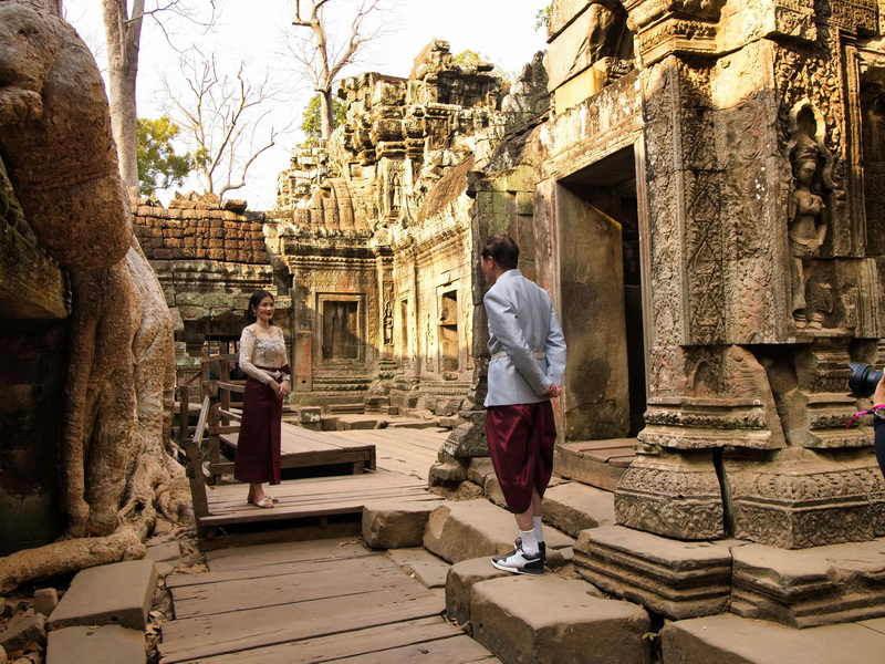 Auf Ta Prohm hatten wir uns am meisten gefreut. Entsprechend gelassen nahmen wir es hin, dass eine kleine asiatische Reisegruppe, hübsch herausgeputzt, einige der besten Fotomotive in Beschlag hielt. Wir nahmen es mit Humor – und fotografierten sie hin und wieder einfach mit.