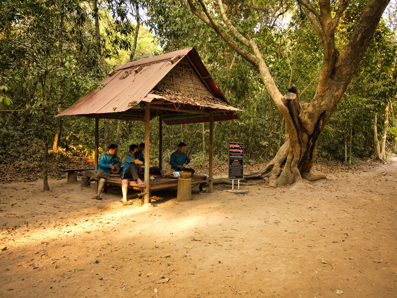 Im Ausgangsbereich, der gleichzeitig auch der Eingang war, trafen wir noch auf eine Musikgruppe. Diesmal keine Mönche, sondern Kriegsversehrte und Opfer von Landminen – ein ernüchternder Hinweis darauf, dass die Vergangenheit in Kambodscha vielerorts noch sehr präsent ist. Ihre Musik war ruhig und eindringlich – ein stiller Kontrast zur touristischen Betriebsamkeit ringsum.