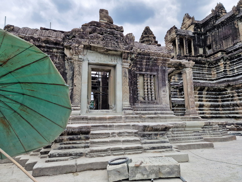 Hinter der nächsten Ecke gelangten wir wieder in einen der Innenhöfe. Noch befanden wir uns innerhalb der innersten Galerie rund um den Hauptturm. In einem der Pavillons liefen gerade Restaurierungsarbeiten. Das Gebäude war eingerüstet, und mehrere Arbeiter waren damit beschäftigt, Steine zu sichern und beschädigte Stellen auszubessern.