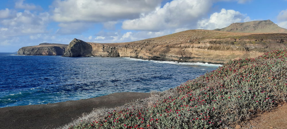 Der Blick über unsere rechte Schulter bescherrte uns einen atemberaubenden Blick über die raue Küste der Punta Gorda und gleichzeitig auf lieblich blühende Mittagsblumengewächse.