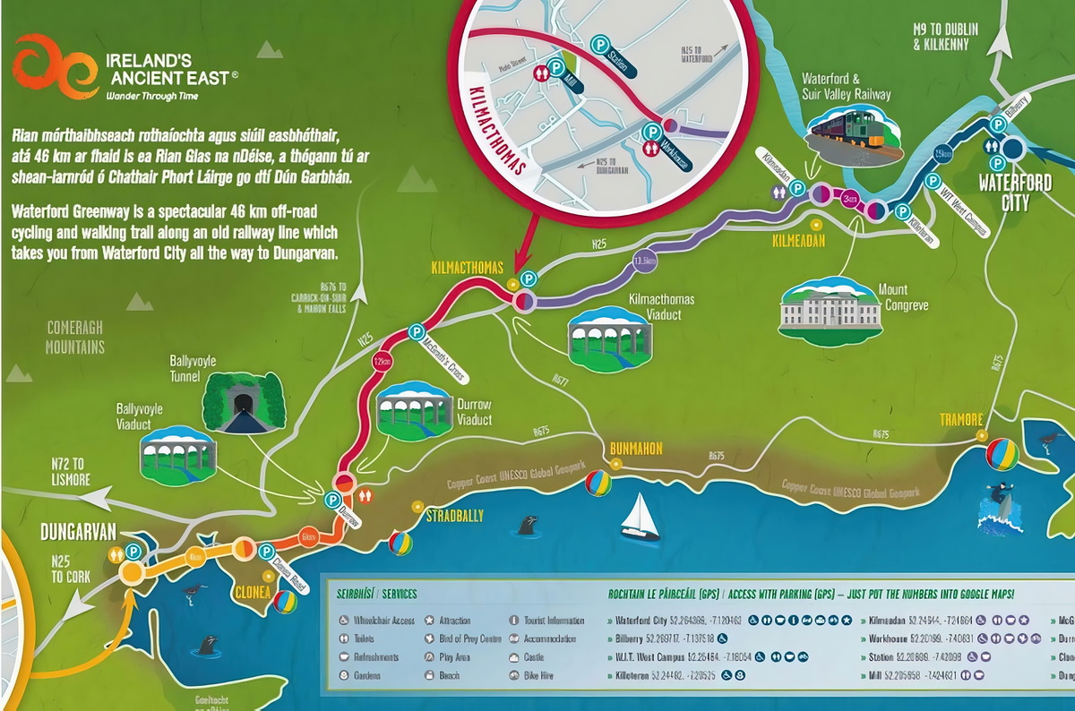 Er verfügt über 11 Brücken, drei Viadukte und einen 400-Meter-Tunnel und verläuft zwischen der Stadt Waterford, Mount Congreve, Kilmeaden, Kilmacthomas und Dungarvan und führt entlang eines Teils der Copper Coast. Mit 46 km ist es Irlands längster Greenway. Die Waterford und Suir Valley Railway teilt sich die Route entlang der Ufer des Flusses Suir.