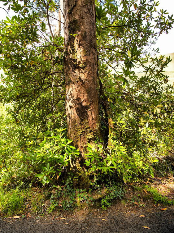 Am Rande der alten Aasleagh Falls Bridge fanden wir einen kleinen Parkplatz. Von dort aus war es nur noch ein kurzer Spaziergang bis zum Ziel. Der Weg führte durch typisch irische Landschaft: schön gewachsene, alte Eichen und Pinien säumten den Pfad, teilweise umwachsen von Rhododendren – schade nur, dass ihre Blütezeit bereits vorbei war. Auf der gegenüberliegenden Seite krochen üppige Farne den kleinen Hang hinauf und verliehen der Szenerie ein fast märchenhaftes Flair.