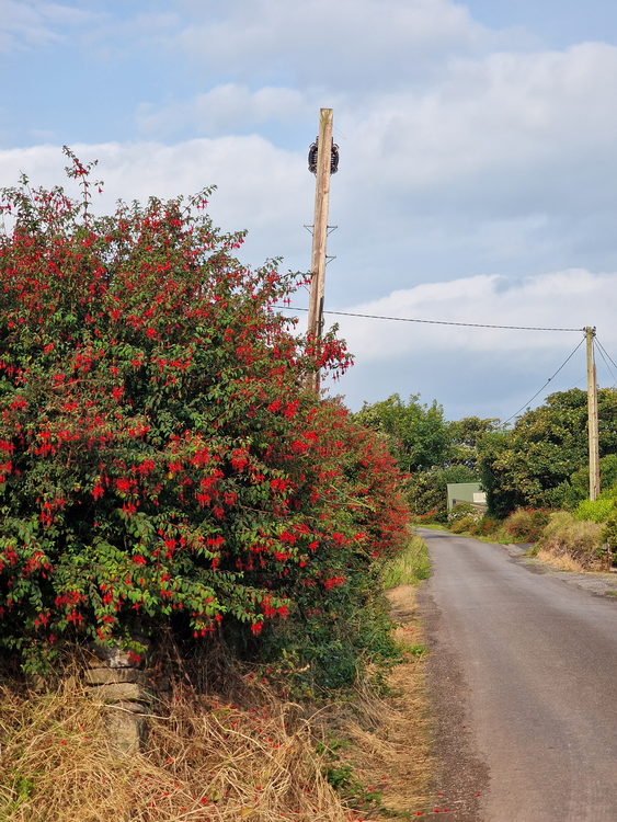 Der Weg zurück zum Parkplatz führte uns wieder an einer schönen Fuchsienhecke vorbei. Schade, dass es solche Hecken bei uns nicht gibt.