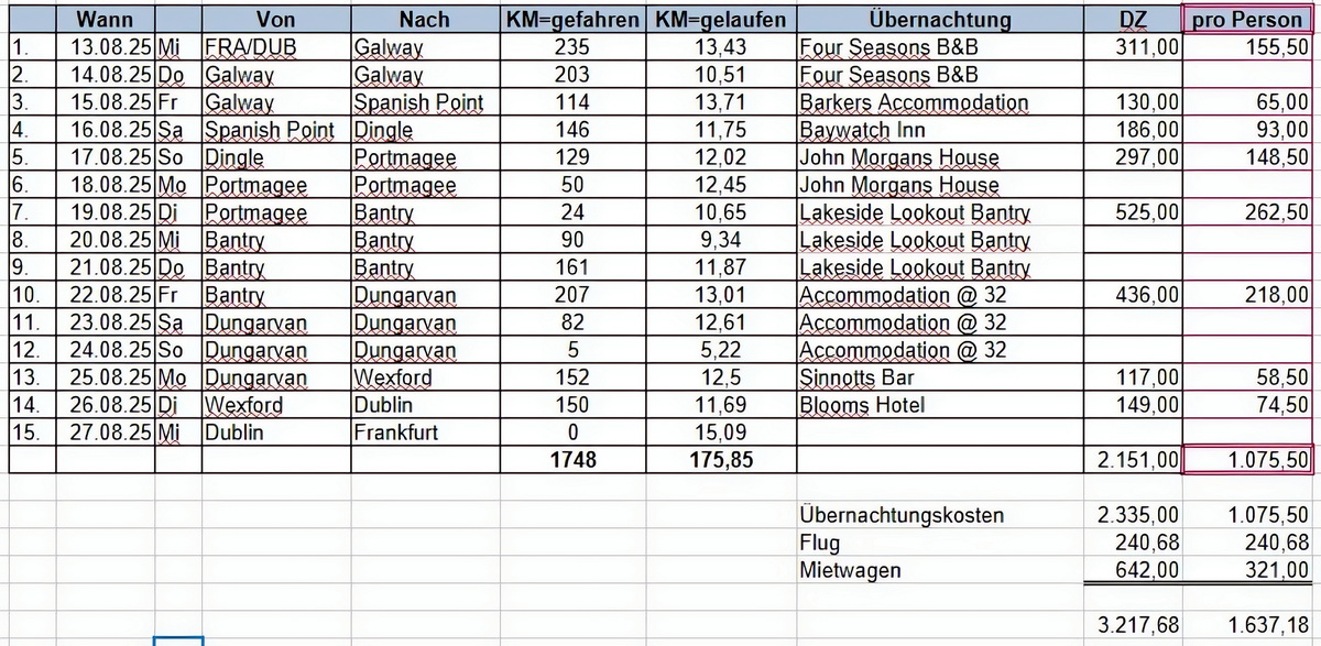 Während unserer Tour legten wir insgesamt 1.748 Kilometer mit dem Auto zurück. Zusätzlich wanderten wir rund 176 Kilometer und erkundeten weitere 78 Kilometer mit dem Fahrrad.
