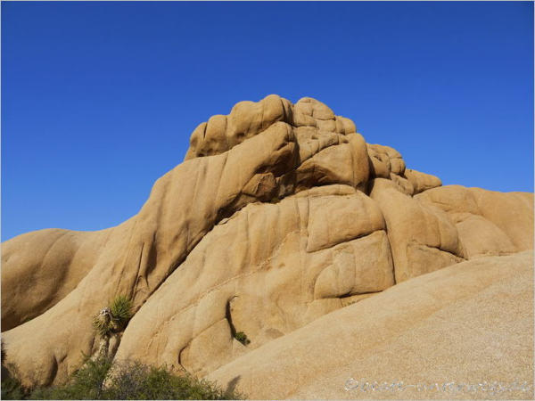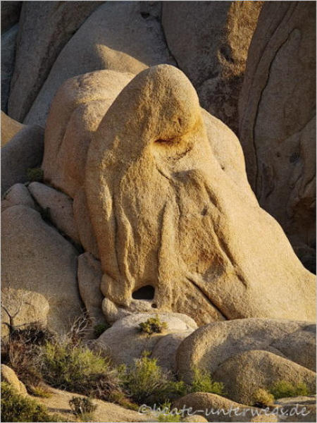 AufdemWegzumJumboRockCampgroundkamichnochanein paarbesondersschönenundmächtigenJoshuaTreesvorbei.Mehr Fotos findet ihr in der Fotogalerie.AmCampgroundangekommenparkteichBlackyso,dasserniemand behinderte und machte mich auf den Weg. Jetzt,sokurzvor17:00Uhr,wurdendieFelsenvoneinemwarmen Lichtangestrahlt,dasdieFelsenfastgoldenschimmernließ.Die Felsformationengefielenmirrichtiggut,wasmirnichtgefielwar, dassmanimmerüberdenPlatzandererLeutelaufenmusste.Ich kammirsovor,alswürdeichdurchihrWohnzimmerlaufen.IrgendwiewardaskeingutesGefühl.VielleichtwardiesauchderGrund,weshalbichmichhierweitauskürzeraufhielt,alsichesangedacht hatte. Ich muss gestehen, dass mir diese Zeltplatzatmosphäre doch schon sehr fremd war. DieLeutewarenzwarallesamtnett,aberichfandeskomisch.Ichdrehtedaherauchschonrechtfrüh wieder ab und liefzurück zu Blacky. EigentlichwarichdannschonaufdemRückwegnachYuccaValleyalsicheherdurchZufallnochüberden ScullRockstolperte.Nagut,dannfotografier’ichdenhaltauchnoch,dachteichmirundschautemir natürlich noch ein bisschen mehr an.MeinletzterPunktimParkwardanndieRegionrundumdenSplitrock.Hiersollteeszum Sonnenuntergang ganz nett sein. AlsichamParkplatzankam,strahltendieFelsengeradenochimletztenLichtdesTages.EineWanderung lohntehierleidernicht,daderWeghinterdemSplitrockverliefundallesdortschonimSchattenlag. Ichtrödeltetrotzdemnochetwasrum,daichkeineLusthattewiedergegendieuntergehendeSonne nach Yucca Valley rein zu fahren. AlsichmichdannaufdenWegmachte,wardie Sonnegeradeuntergegangen.ImDämmerlichtfuhr ichzurückindiekleineStadt.Abendessengabes heutebeiSizzler.DasSteakwarköstlichunddas Salat-undNachtischbuffetgutbestückt.Das abschließendeBierzischtelecker.Lichtauswar um 22:30 Uhr.Meilen: 77Best Western, Yucca Valley, CAJoshua Tree NPJoshua Tree NP - Hidden Canyon TrailJoshua Tree NP - Wonderland Wash + Wallstreet Mill