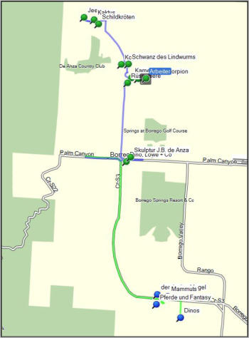 Von Borrego Springs aus ist die Anfahrt recht kurz. Pro Seite würde ich 5 bis 10 Minuten schätzen.