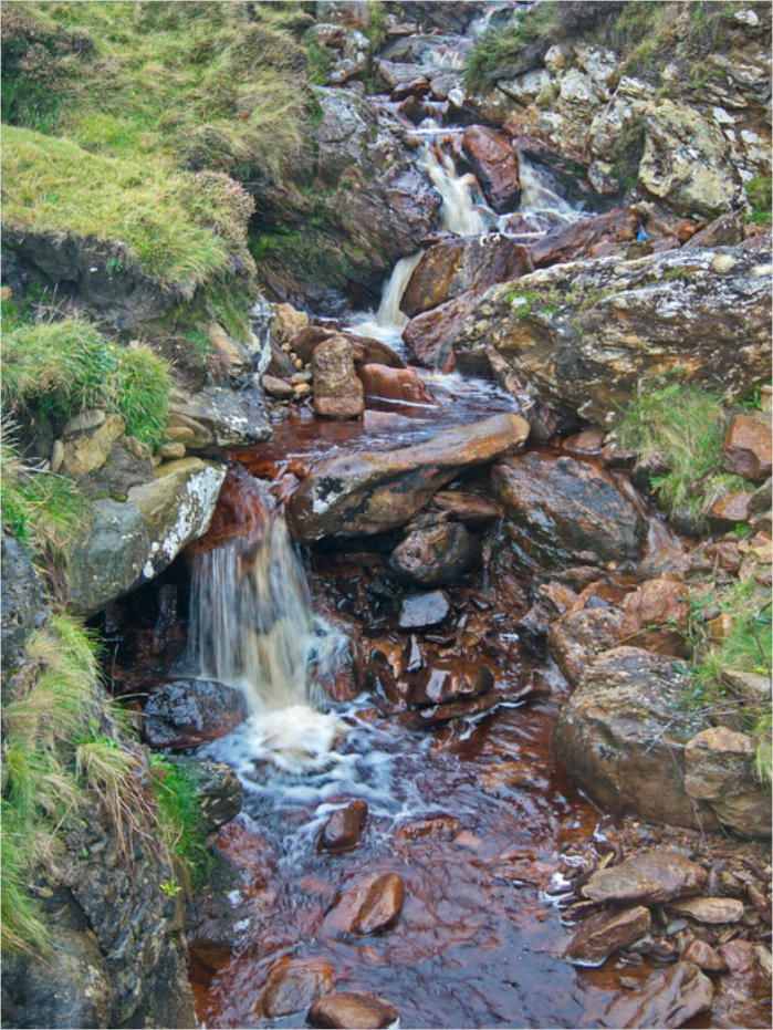 schmaler Bach in kleinen Arkaden den Berghang hinunter.