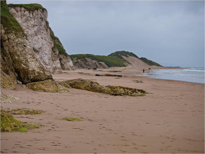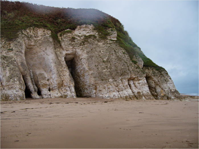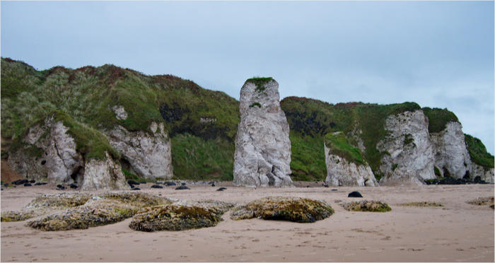 breiten Sandstrand mit seinen mächtigen weißen Felsen.