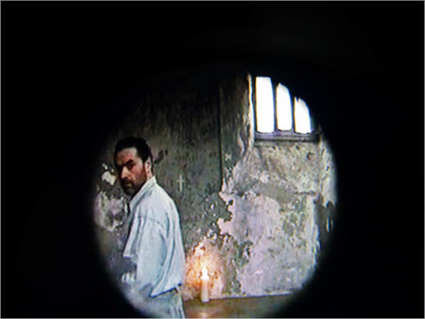 Hier kann man zwei Menschen beobachten, die unruhig in einer Zelle auf- und ablaufen.