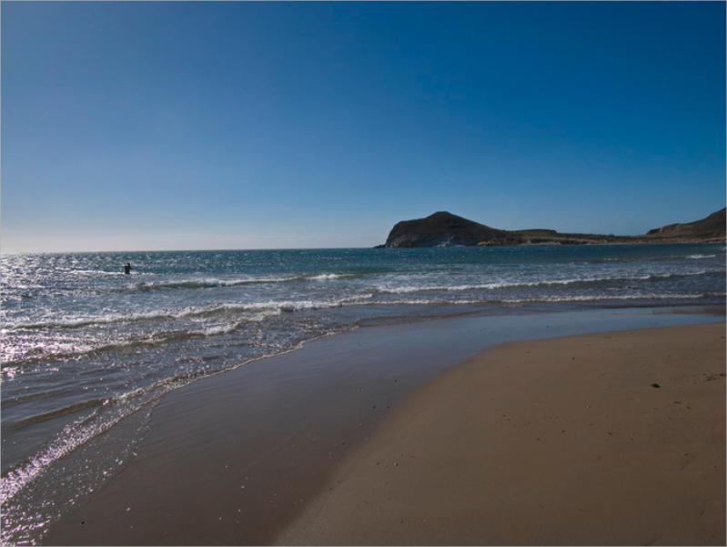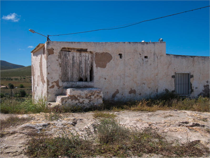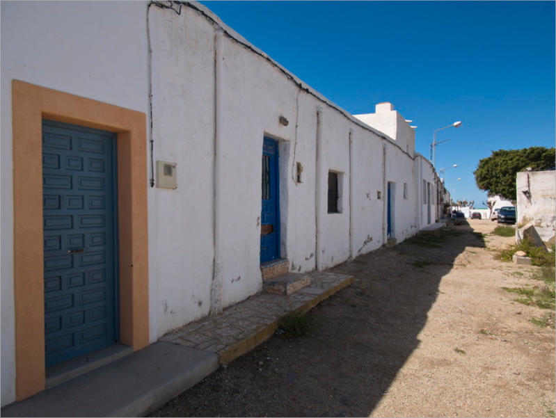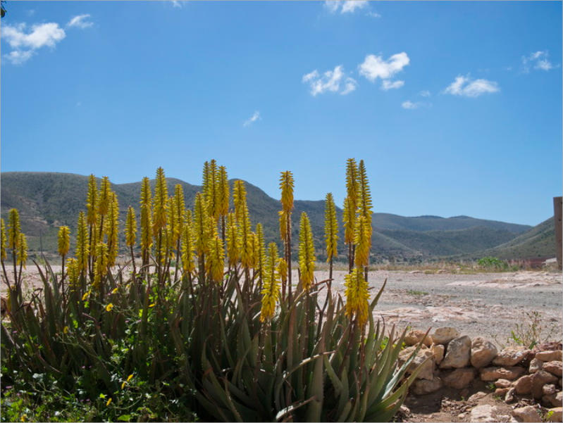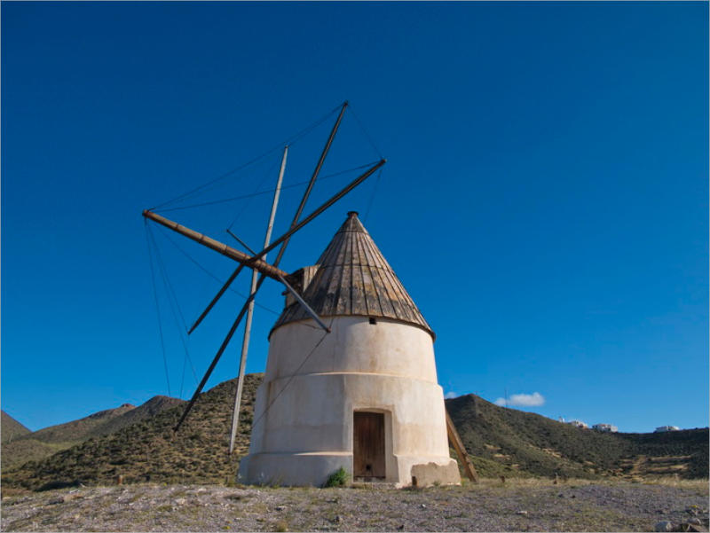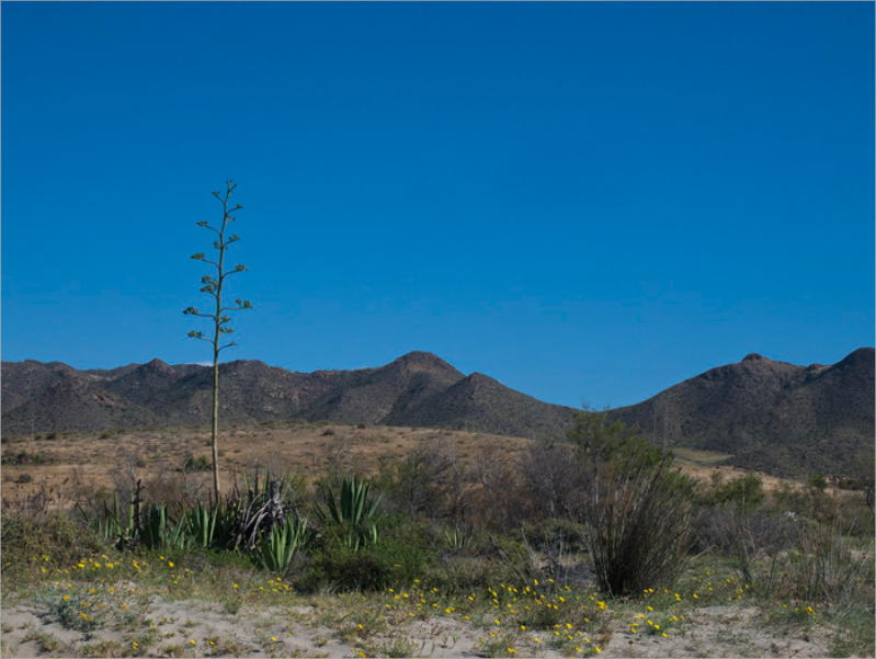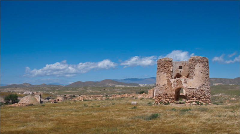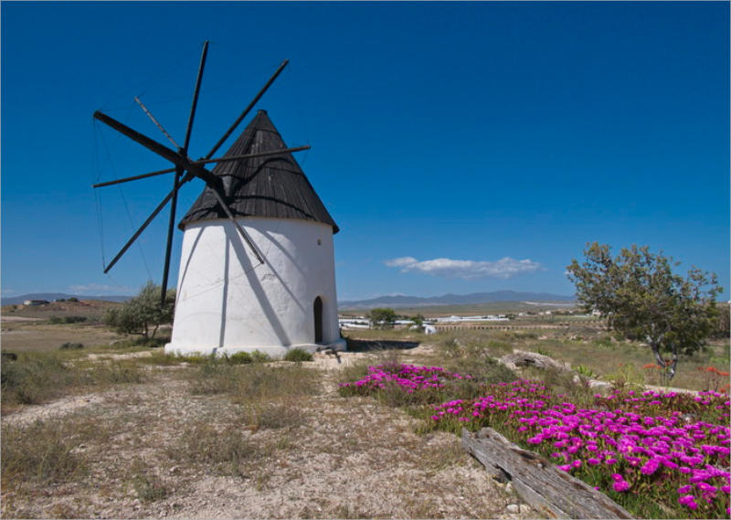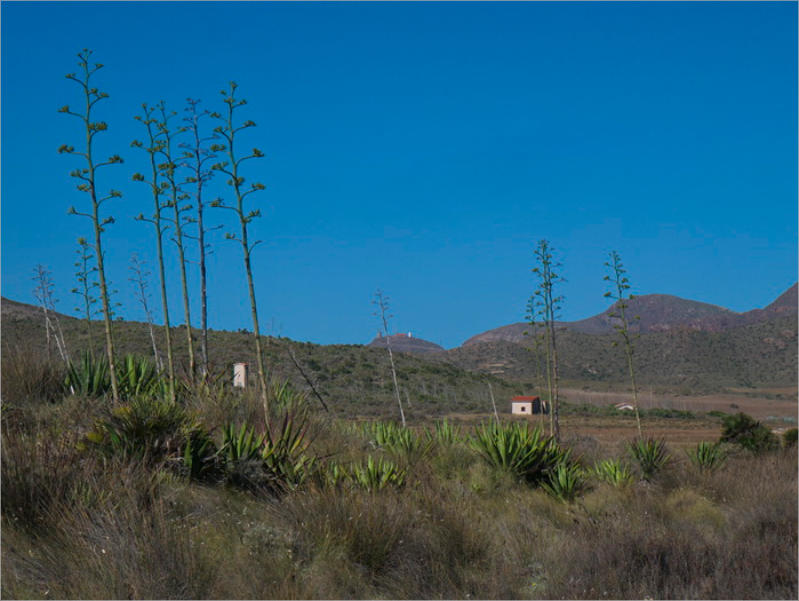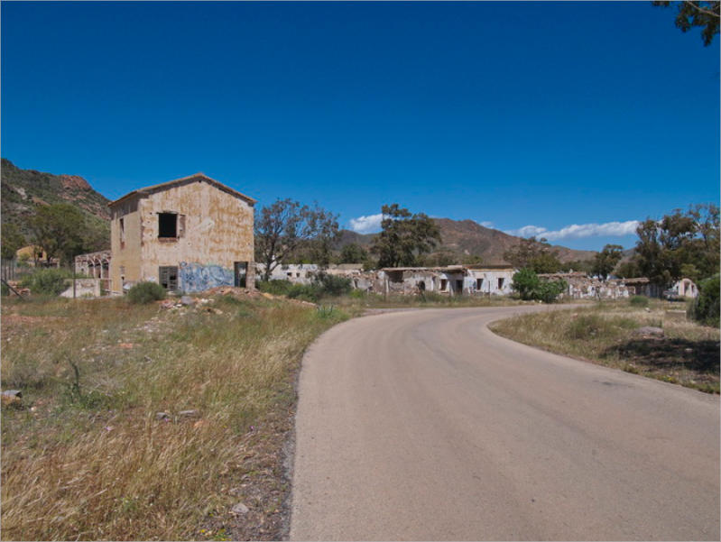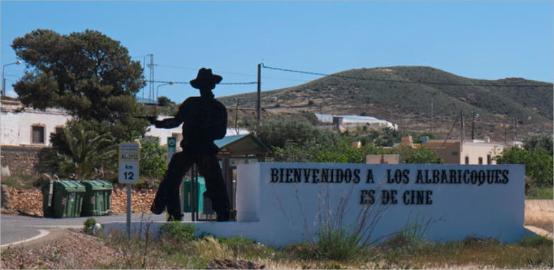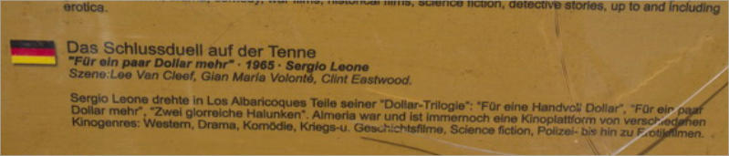 Der Tag fing eigentlich recht vielversprechend mit einem schönen Sonnenaufgang an. Da es noch etwas frisch auf meiner Terrasse war verzog ich mich aber immer wieder ins warme Zimmer. Noch war es windstill und ich ahnte noch nicht, dass sich der heutige Tag so ganz anders als geplant abspielen würde.Geplant hatte ich heute nämlich eigentlich recht wenig. Heute sollte mein Strandtag sein. Darauf hatte ich mich schon seit Tagen gefreut.Gut gelaunt packte ich meine Tasche mit den Strandsachen und zog kurz darauf los. Einer der naturbelassenen Strände rund um San José im Naturpark Capo de Gata war mein Ziel.Kurz nachdem ich den Ort hinter mir gelassen hatte fuhr ich - wie nicht anders erwartet - auf einer Staubpiste. Nach wenigen Metern erreichte mich hier die nächste Überraschung. Ich erblickte schon wieder eine schöne Windmühle. Ich parkte daher am Straßenrand um die restaurierte Windmühle zu fotografieren. Hierbei kam ich zum ersten Mal mit dem heftigen Wind, der mich heute den ganzen Tag begleiten würde, in Berührung.Ab der 2007 restaurierten Windmühle „Molino del Collado de los Genoveses“ändert sich das Landschaftsbild.Ab hier beginnt der wildeste Teil des NaturparkesCabo de Gata in der andalusischen Provinz Almeria. Von der Windmühle aus schweift der Blick hinab in eine Ebene, die bisher von jeglichen Auswüchsen der modernen Welt verschont wurde. Es gibt weder Hotels noch Restaurants und keinerlei Touristenattraktionen.Lediglich eine schmale, kaum gepflegte Sandpiste führt durch den Naturpark der offiziell auf den Namen „Parque Natural Cabo de Gata-Níjar“ heißt, zu den naturbelassenen Stränden.Eigentlich wollte ich ja direkt bis zum weiter entfernten Punta del Monsul durchfahren, denn dieser sollte einer der schönsten Strände in diesem Gebiet sein. Aber der heftige Wind führte dazu, dass ich gar nicht weiter fuhr sondern erst einmal zu leichter zu erreichenden Playa de Los Genoveses fuhr.Obwohl heute Sonntag war, standen kaum Fahrzeuge auf dem Parkplatz. Und die die dort standen gehörten meist Campern, die jetzt kurz nach 9:30 Uhr noch schliefen.Obwohl mir der Wind den Sand nur so ins Gesicht peitschte ging ich an den Strand. Ich kenne viele Fotografen, die bei diesem Wind ihre Kamera gar nicht ausgepackt hätten, aber ich kenne da nix und kann euch jetzt schon sagen, meine Kamera und auch die Objektive haben es gut überlebt. Wenn man sich die Wellen im Sand anschaut, kann man sich vielleicht vorstellen wie windig es war. Außerdem sprach natürlich die Leere am Strand dafür, dass heute nicht gerade Badewetter war, obwohl der fast wolkenlose Himmel dies nicht vermuten ließ. Könnt ihr die Windböen sehen, wie sie den Sand den Strand hinauf jagen?Ein Verrückter hat sich dann doch noch nackig ins Wasser gewagt.Ich hatte nach einer halben Stunde genug Sand zwischen den Zähnen und verwarf erst einmal meinen heutigen Plan. Plan B musste her. Da jetzt erst einmal nichts aus meinem Strandtag werden würde überlegte ich, was ich den restlichen Vormittag noch so anstellen könnte. Nach einem kurzen Blick auf die Landkarte beschloss ich bereits heute die Umgebung zu erkunden. Dies hatte ich eigentlich erst für morgen geplant. Da mir an der Küste der Wind zu stark bließ entschied ich mich dafür erst einmal ins Landesinnere zu fahren. Kurz vor meinem Reiseantritt hatte ich in einem der dritten Programme eine Dokumentation über einen kleinen Ort ganz in der Nähe von San José gesehen. In diesem Ort wurden wurden wegen seinem Erscheinungsbild, das in den 60er Jahren des letzten Jahrhunderts sehr an ein mexikanisches Dorf erinnerte, einige Italo-Western gedreht.Nach knapp 20 Minuten Fahrt erreichte ichSchon am Dorfeingang war klar, um was es hier ging.Gespannt fuhr ich weiter.So richtig hatte ich leider nicht mehr im Gedächtnis, was in der Dokumentation so alles gezeigt wurde. Ich konnte mich nur noch daran erinnern, dass einer der Einwohner (inzwischen ein Mann um die 50/60) , der die Reporterin durch den Ort führte erzählte, dass er als kleiner Junge als Statist bei einigen berühmten Spaghetti-Western mitgewirkt hatte. An einem kleinen Platz suche ich mir erst einmal einen Parkplatz. Von hier aus erkundete ich nun das Dorf. Wie sich heraus stellte hatte ich in der Avenida Sergio Leone geparkt. Daran konnte ich mich noch erinnern. Einige Straßen im Dorf waren nach Protagonisten der Italo-Western benannt. Ich war gespannt, ob ich alle finden würde.Ich muss ja mal gestehen, dass ich von Italo-Western überhaupt keine Ahnung habe. Bisher hatte und habe ich bis auf „Spiel mir das Lied vom Tod“ nicht einen Italo-Western gesehen. Wahrscheinlich war es daher kein Wunder, dass ich mich nicht wie im wilden Westen bzw. wie in einem mexikanischen Dorf fühlte. Ich fand das Dorf zwar recht pittoresk, aber das war es dann auch schon. Schaut am Besten mal selbst:Es scheint auf jeden Fall als würden die Bewohner hier sehr gerne backen.Bei meinem Rundgang hatte ich zwar nicht das mexikanische Dorf Aguas Caliente, dafür aber eine kleine Tienda entdeckt, die heute am Sonntag sogar geöffnet hatte. So kam ich wenigstens an eine Flasche Wasser und etwas Obst. Ein gutes Gefühl, hier wenigstens etwas die Wirtschaft angekurbelt zu haben, gab es quasi umsonst dazu. Ich beschloss weiterzuziehen. Auf der Fahrt aus dem Dorf hinaus fiel mir dann doch noch eine Infotafel auf. Auf dieser waren die Drehorte mit grünen Punkten markiert. Aha, dachte ich bei mir. Da gibt es wohl doch noch etwas mehr. Ich parkte daher erneut und zog noch einmal los. Als erstes entdeckte ich den Platz an dem das Schlussduell aus „Für ein paar Dollar mehr“ stattgefunden hat. Wer den Film kennt, wird diesen Ort an dem sich Lee van Cleef und Gian Maria Volonté, unter den Blicken von Clint Eastwood, ein letztes Duell lieferten, erkennen. Hier findet ihr die Szene als Youtube-VideoNachdem ich die erste Location ausgemacht hatte, folgten natürlich weitere.Inzwischen machte es mir richtig Spaß