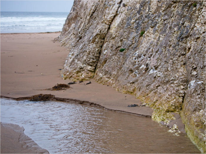 breiten Sandstrand mit seinen mächtigen weißen Felsen.