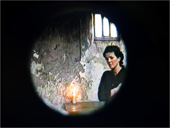 Hier kann man zwei Menschen beobachten, die unruhig in einer Zelle auf- und ablaufen.
