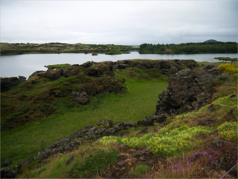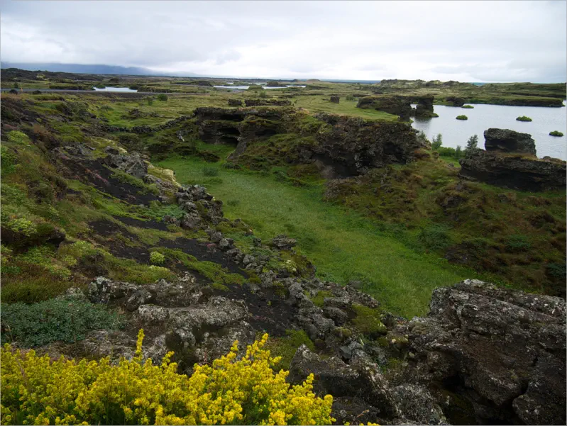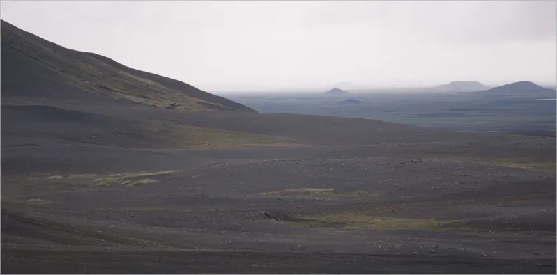 Die große Bergkette im Hintergrund sind die Dimmifjallgarður. Was für eine karge Gegend. Hier hätte man glatt die