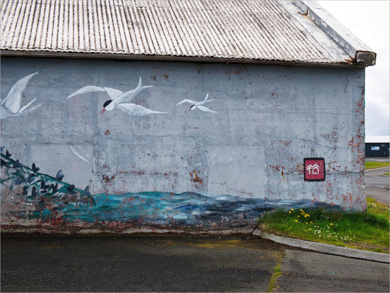 An der Hauswand befand sich ein uraltes Grafitti und auf der anderen Straßenseite eine interessante Skulptur.