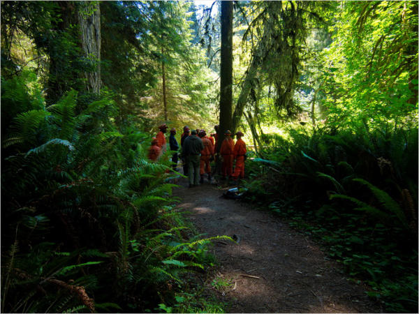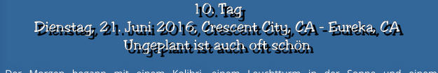 Der Morgen begann mit einem Kolibri, einem Leuchtturm in der Sonne und einem Vogelschwarm im Nebel.Aber lasst mich der Reihe nach erzählen:Heute Morgen strahlte die Sonne so schön, dass ich beschloss, nach dem Frühstück nochmal zum Leuchtturm zu fahren. Gesagt, getan. Gleich am Anfang des Weges blieb ich bei einem Kolibri hängen, der nervös um die bunten Blümchen flog. Der Weg zum Leuchtturm lohnte sich richtig. Erst im Morgenlicht zeigte sich der kleine Leuchtturm in seiner vollen Pracht. Am Parkplatz verquatschte ich mich dann noch eine ganze Weile mit einem älteren Ehepaar. Das war richtig nett. Auf dem Rückweg vom Leuchtturm ging ich dann noch im Besuchszentrum zum Redwood NP vorbei und besorgte mir Infomaterial.Auf der Suche nach den Seelöwen fuhr ich zum Fischereihafen von Crescent City. Kaum war ich dort, zog Nebel auf. Die Lichtstimmung war schon klasse. Im Nebel kommt mir alles immer viel leiser vor. Vielleicht täusche ich mich da ja. Ich war auf jeden Fall sofort fasziniert von dieser Lichtstimmung. Ach ja, auf der Suche nach Seelöwen traf ich für diese Gegend sehr seltene Raubtiere. Und während es sich auf der einen Seite die Seelöwen auf einem Floß gemütlich gemacht hatten, hatten die Vögel die Strandseite des Hafens für sich erobert. Es war schon ein tolles Schauspiel, das sich hier im Nebel bot. Ich kam mit einer Fotografin ins Gespräch. Wie sich herausstellte, kam sie aus Australien. Mit ihrem Mann war sie schon ein paar Monate mit einem Trailer unterwegs. Dieser stand nun auf dem Trailerparkplatz, während sie mit dem Auto bequem an den Hafen gefahren waren. Wie sich im Verlauf des Gespräches herausstellte, waren wir uns schon gestern am Cape Sebastian SPbegegnet. Sie gab mir dann noch als Tipp mit auf den Weg, unbedingt im nahegelegenen Chart Room Restaurant ein Krabbenbrötchen zu essen. Wegen diesem kam ich erst spät in Crescent City los, denn das Restaurant öffnete erst um 11:00 Uhr. Das Krabbenbrötchen war wirklich super lecker. Dazu gab es noch einen recht großen Salat. Insgesamt war dies aber kein günstiges spätes Frühstück. IEs kostete mich 15 $, hat sich aber gelohnt.Das war echt ein interessanter Vormittag, wenn er auch ganz anders geplant war. Ich hatte interessante Gespräche mit einem sehr alten Ehepaar aus dem Ort, einer Lady aus einem Vorort und einem Paar aus der Nähe von Brisbane, Australien, die mir gestern schon mehrfach begegnet waren. Der Nebel begleitete mich noch eine ganze weile auf meiner Tour in die Redwoods.Erst gegen 12:00 Uhr enterte ich den Redwood NP.Hier lief ich zwei Trails. Der erste Trail war recht easy. Genau das Richtige zum Anfüttern. Der Ah Pah Interpretive Trail war gerade einmal einen halben Kilometer lang. Für den Anfang fand ich ihn ganz nett. Der Prairie Creek-Trail dagegen ging ganz schön den Wald hoch. Beide Wege fand ich sehr beeindruckend. Das war schon etwas anderes, als an der Avenue de Giants herumzulaufen. Hier war man in einem richtigen Wald. Gerade auf dem Prairie Creek-Trail kann man erleben wie es ist, durch einen Redwood-Wald zu wandern. Die Ausmaße dieser Bäume sind schon unglaublich. Gleich zu Anfang überquert man den kristallklaren Prairie Creek. Dort soll man im Winter und Frühjahr Lachse laichen sehen. Dafür war ich schon etwas zu spät. Ist man über die Brücke, führt der Weg beständig auf einem schönen Waldweg bergauf. Je höher man kommt umso atemberaubender werden die Blicke in den Wald hinunter. Aber seht selbst:Wer noch nicht genut hat von den Redwoods, kann sich ja noch das nachfolgende Filmchen anschauen. Aber seht es mir bitte nach, ich übe noch :-)Als ich anschließend im Visitor Center nach dem Weg zum Fern Canyon fragte, wollte mich der Ranger doch glatt von hier aus zum Fern Canyon schicken. Erst als ich zum Trailhead lief und noch ein Stück über den Board Walk gelaufen bin, kam es mir. Nee, so weit wollte ich nun auch nicht laufen. Bis zum Erreichen des Fern Canyons wären es von hier aus ca. 4 Meilen gewesen und ich hätte dies ja alles wieder zurück laufen müssen. Ich ging dann recht schnell zurück zum Auto. Dort konnte ich auf der Karte genau sehen, wohin ich fahren musste, um zum Parkplatz des Fern Canyons zu gelangen. Gegen 15:00 Uhr war ich auf dem Weg zum Fern Canyon. Die Fahrt hierher führt über eine 8 Meilen lange, unbefestigte, schmale Straße mitten durch den Wald und später an einem Strand vorbei. Wieso sagt einem das niemand? Kurz vor dem Strand gibt es dann tatsächlich eine Bezahlstation. Da ich aber den Anual-Pass hatte, brauchte ich nichts zu zahlen. Auf der Strecke sah ich die Folgen eines heftigen Unfalls. Polizei und Abschleppwaren waren zum Glück schon da und der Family war wohl nix passiert. Das Auto war allerdings hin. Die haben mir richtig leidgetan, wie sie so betölpelt am Straßenrand standen.Ich kam dann so gegen 16:00 Uhr am Fern-Canyonan. Eigentlich wollte ich ja schon um 13:00 Uhr hier sein, aber so war es auch o.k. Wie schon vielen vor mir, gefiel mir der Trail in diesem schon ungewöhnlichen Canyon sehr gut. Die Kraxelei war auch schon ein netter Test für weitere Wanderungen, die ich ja noch machen wollte. Insgesamt gesehen wäre ich wegen der besseren Lichtverhältnisse schon gerne eins, zwei Stündchen eher hier gewesen, aber so war es auch o.k. Bevor ich mich auf den Rückweg machte, bin ich noch am Strand vorbei und schaute dort ein ½ Stündchen in die Wellen. Schön war's und Farbe hab ich auch bekommen.Als letzte Station fuhr ich noch an einem kleinen Trinidad Head Memorial Lighthouse vorbei. Echt süß der Kleine. Von hier aus fuhr ich direkt zu meinem Motel in Eureka. Dort checkte ich ein, duschte und brach dann gleich wieder auf zur Lost Coast Brewery. Hier gönnte ich mir heute einen Burger mit Pulled Porck und ein leckeres Bier.