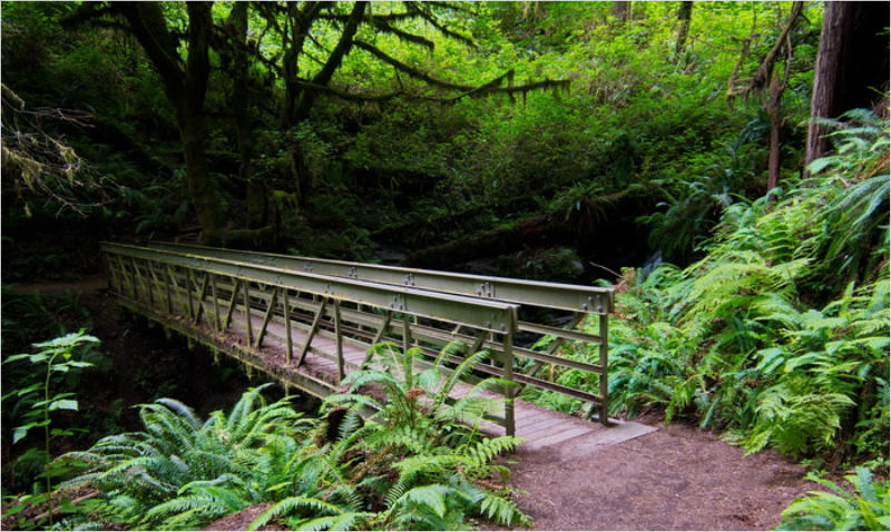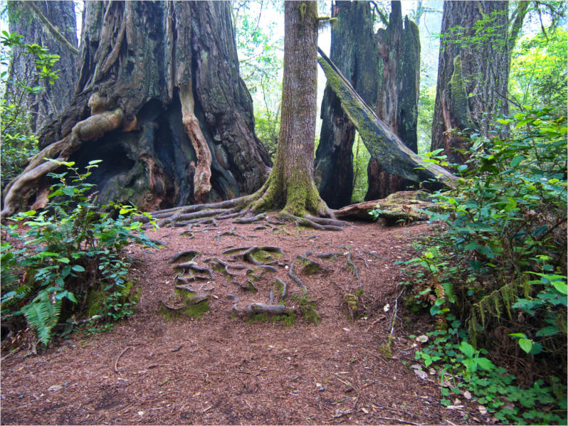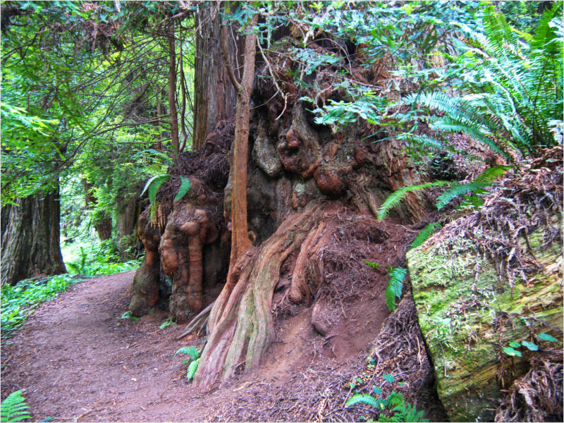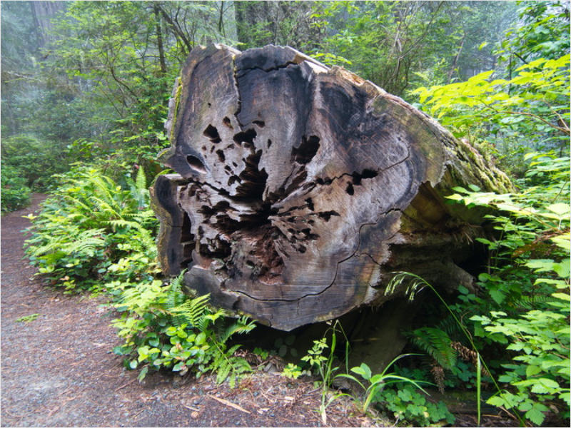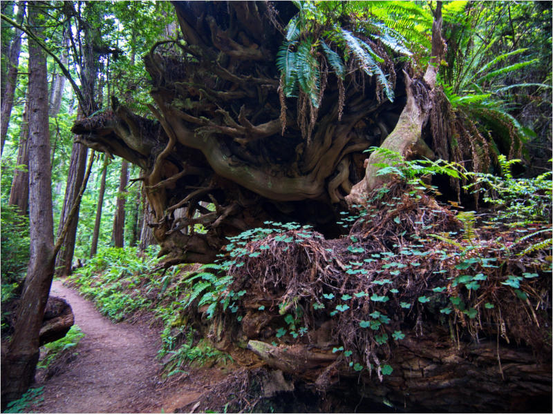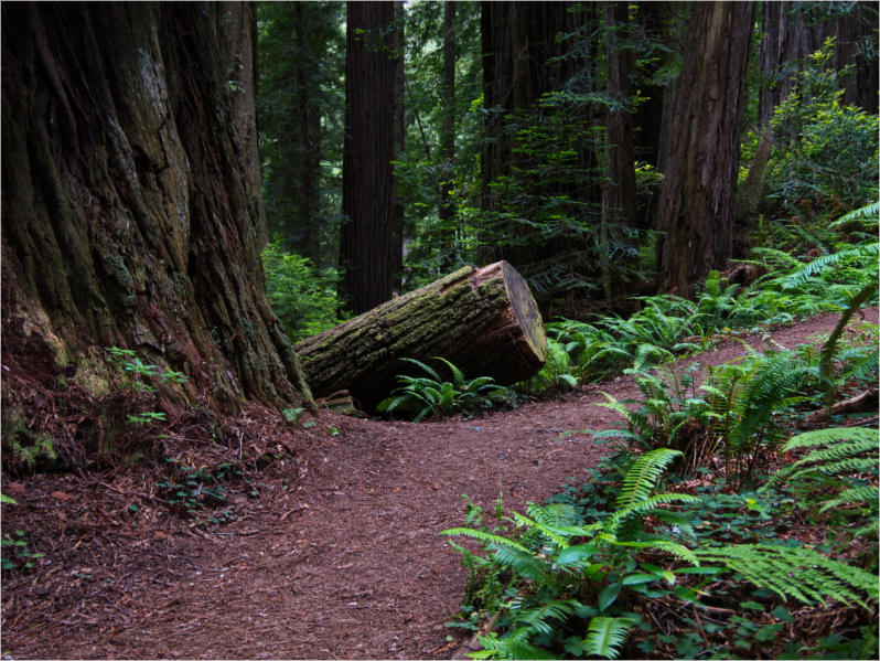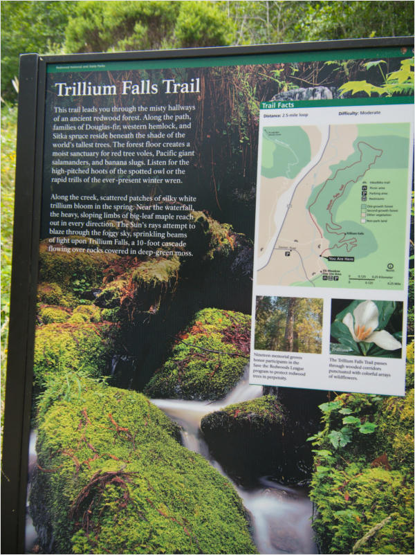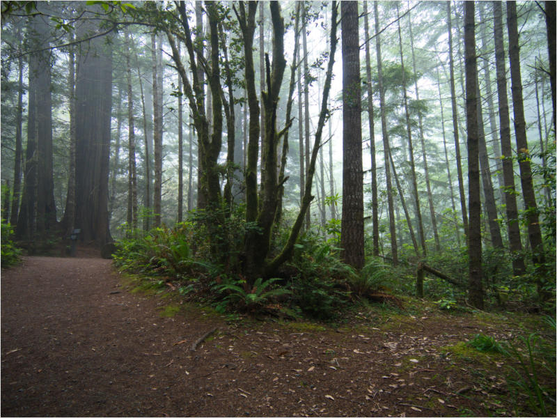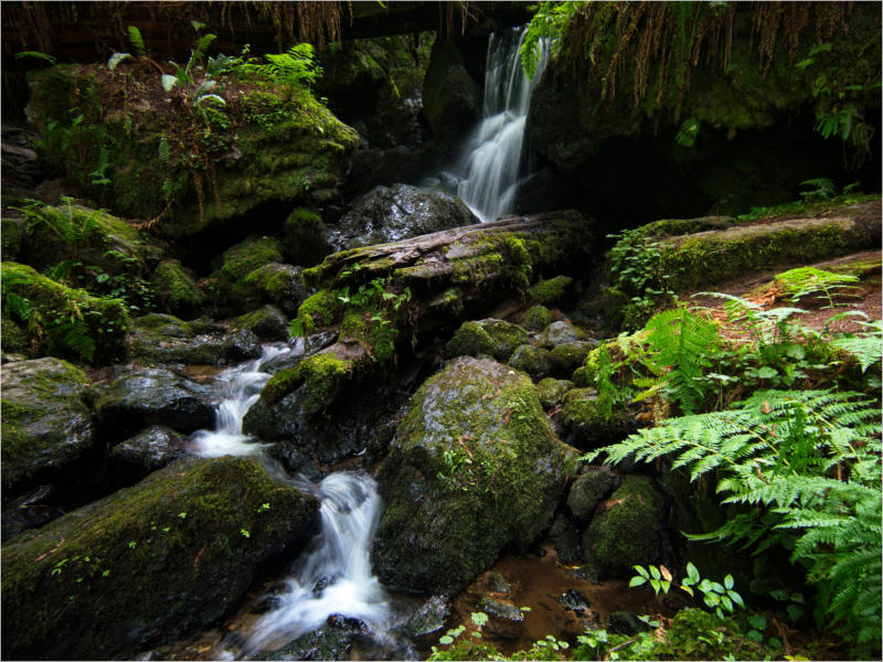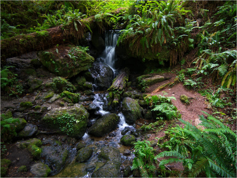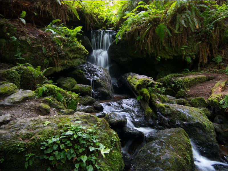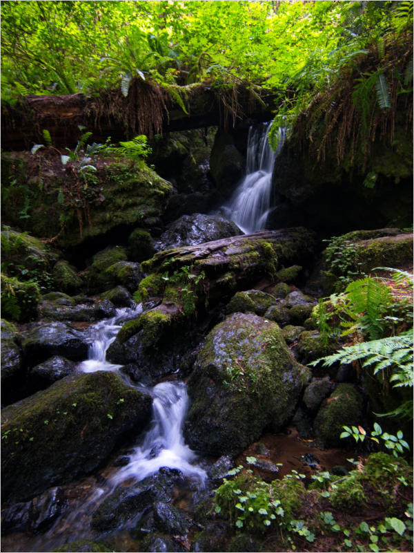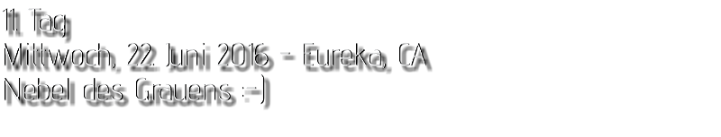 Gestern Abend hab ja noch hin und her überlegt, ob ich heute – wie geplant – erneut in die Redwoods fahren wollte. Letztendlich traf das Wetter die Entscheidung. Obwohl der Tag gestern so sonnig geendet hatte, war heute Morgen alles grau in grau. Also genau das richtige Wetter, um in den Wald zu fahren.Dies tat ich dann auch nach dem Frühstück. Auf dem Weg zum Redwood NP fing es sogar an, etwas zu regnen. Bis ich am Parkplatz am Lady Bird Johnson Trailwar, hörte es aber zum Glück auf. Ich weiß nicht, ob ich mich im Regen aufgerafft hätte, diesen Weg zu laufen. Es fiel mir so schon schwer, denn es war etwas kühl im Wald. Aber was soll’s: „Nur die Harten kommen in den Garten“ und so zog ich in den Wald. Der Weg war auch ganz nett. Ich lief den Trail gegen den Uhrzeigersinn. Ich hatte ja gehofft, dass sich der Nebel im Wald verziehen würde. Leider handelte es sich um richtigen Hochnebel und der hing im Wald fest. Nachdem ich mich mit den Temperaturen angefreundet hatte, fand ich es gar nicht so uninteressant durch den nebligen Wald zu laufen. Das hatte was von einem Edgar Wallace-Roman. Bis auf die schönen Blümchen, die kommen in diesen Romanen nie vor. Die Lichtstimmung war meist sehr schön, da sich ab und an die Sonne durch den Nebel quetschte. Und da der Lady Bird Johnson-Trail gerade einmal eine Meile lang war, stand ich nach einer ¾ Stunde schon wieder auf dem Parkplatz. Da sich der Nebel immer noch nicht verzogen hatte fuhr ich gleich weiter zum Den Parkplatz hatte ich dank Navilinchen ja recht einfach gefunden. Aber hier stellte sich plötzlich die Frage: „Wo geht der Trail los?“ Eine Ausschilderung war auf den ersten Blick nicht zu finden. Zum Glück entdeckte ich einen Ranger, der hier bei Reinigungsarbeiten war. Dieser wies mir den Weg. Ohne ihn wäre ich wohl unverrichteter Dinge wieder gefahren. Mit Hilfe vom Ranger lief ich in die richtige Richtung und fand dann auch tatsächlich ein Wegweiser. Dieser wies daraufhin, dass es noch 0,1 Meilen bis zum Trail waren. Darauf muss man erst einmal kommen. Der Weg führte in den Wald. Hier ging es beständig bergauf. Das mag ich ja ganz gerne, da es dafür dann auf dem Rückweg meist bergab geht. Dieser Wald war ganz anders, als der am Lady Bird Johnson-Trail. Hier konnte man riesige Baumwurzeln bestaunen, und die Seiten des Weges waren mit dichten Farnen bewachsen. Wahnsinn…..was für ein Zauberwald!Es dauerte nicht lange, bis ich an eine kleine Brücke kam. Hier war dann auch schon der Wasserfall. Das Laub und der Farn rund um den Fall sind so dicht bewachsen, dass ich hier ganz ohne Graufilter fotografieren konnte. Und da ich den Wasserfall ganz für mich alleine hatte, konnte ich mich so richtig austoben.Schon bei den ersten Fotos bemerkte ich, dass mir am Stativ eine Schaube fehlte. Ups! Da hatte ich ja wirklich Glück, dass die Kamera noch nicht hinunter gefallen war, denn ich hatte die Kamera schon auf dem Parkplatz auf das Stativ gepflanzt und während des kurzen Trailsgeschultert. Das hätte auch ein böses Ende nehmen können, dachte ich so bei mir. Zum Glück wusste ich jetzt noch nicht, was später passieren würde. Als eine Gruppe Teenager zur Brücke kamen, wurde es langsam Zeit zurückzugehen. Ich schnappte also meine Kamera mit dem Stativ und trat den Rückzug an. Die Kamera ließ ich erst einmal auf dem Stativ, denn den Gurt hatte ich leider im Auto gelassen und da es auf dem Hinweg ja schon kein Problem gab, hoffte ich, dass es auch auf dem Rückweg dabei bleiben würde. Natürlich griff ich alles etwas kürzer und war sehr bedacht, dass Stativ nicht zu drehen.Auf dem Rückweg nahm ich den Boden genau unter die Lupe. Vielleicht hatte ich ja Dusel und fand die fehlende Schraube. Dem war nicht so. Es kam leider schlimmer. Ehe ich mich versah, fiel die Kamera vom Stativ und kullerte sogleich etwas den Hang hinab. Mir blieb das Herz stehen, denn ich begriff sofort, dass, wenn die Kamera weiter fallen würde, ich wohl keine Chance hätte, an sie heranzukommen, da der Wanderweg in eine andere Richtung als der Abhang verlief. Man glaubt gar nicht, was einem so alles in Sekundenbruchteilen (länger hatte der Fall wohl gar nicht gedauert) durch den Kopf gehen kann. Zum Glück wurde die Kamera durch den dichten Farn nach ca. einem Meter gebremst. Jetzt galt es nur (was heißt hier eigentlich „NUR“), die Kamera wieder vorm Abgrund zu retten. Wie es halt immer so ist, kommt gerade in solchen Augenblicken niemand vorbei, um zu helfen. Ich legte also das Stativ und den Rucksack beiseite, setzte mich auf den Hosenboden und hangelte mich vorsichtig den Abhang hinunter, immer bedacht, die Kamera durch meine Bewegungen nicht weiter nach unten zu stoßen. Ich schaffte es dann glücklicherweise, den Fuß unter die Kamera zu legen und hangelte mich vorsichtig nach unten. Zu meiner Erleichterung konnte ich die Kamera greifen. Ich legte sie sogleich hoch auf den Weg und robbte dann selbst vorsichtig zurück. Eine erste Untersuchung ergab erst einmal keine Schäden. Die Kamera war ja auch weich gelandet. Später musste ich dann feststellen, dass am Batteriefach die Feder etwas gelitten hatte. Zum Glück war nicht mehr passiert. Da ich die Wanderung nicht bis zum Ende gelaufen war, hatte ich etwas Zeit eingespart. Diese wollte ich mit der Beobachtung von Elks auffüllen. Aber Elks waren wohl gerade aus. Es gab dann zwar mal eine Menschenan-sammlung am Highway wegen einer Gruppe Rotwild, aber irgendwie hatte ich keine Lust, mich auch noch dazu zu gesellen. Es standen schon genug Fahrzeuge am Rand. Um ½ 12 stand ich am Visitor Center des Eigentlich wollte ich nur die kleinen Totems fotografieren, aber da ich nun mal hier war, fragte ich auch gleich noch nach einer guten Stelle zur Elk-Beobachtung. Der Mitarbeiter gab mir zwar einen Tipp, aber an der angegebenen Stelle konnte keine finden. Als Ersatz fuhr ich dann für ein ½ Stündchen an einen Strand. Die Temperaturen waren zwar recht angenehm, aber da die Sonne