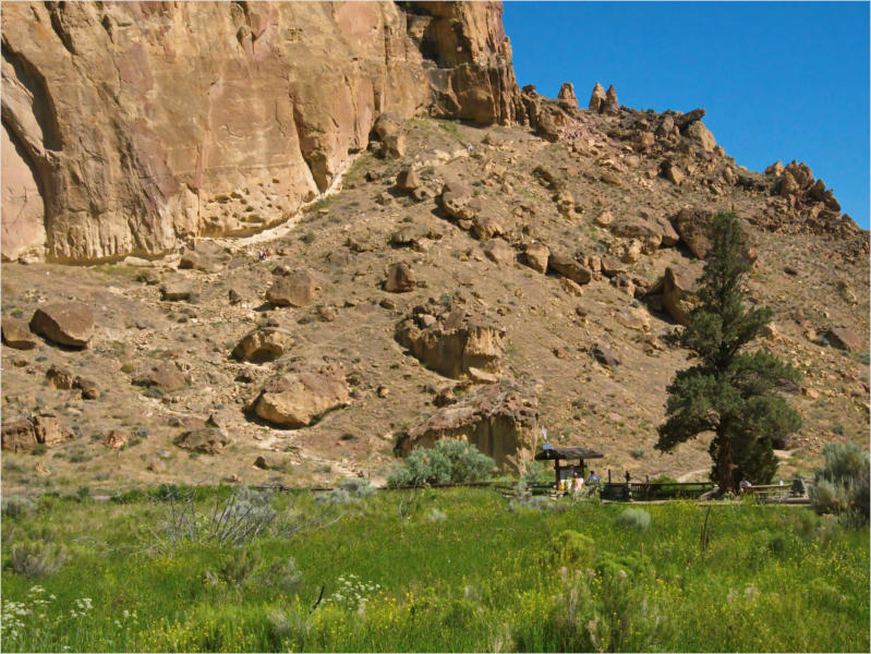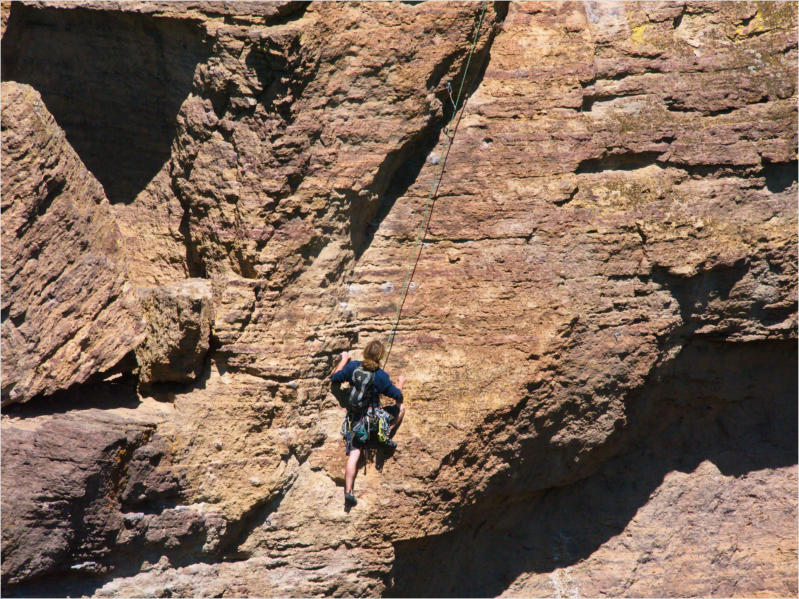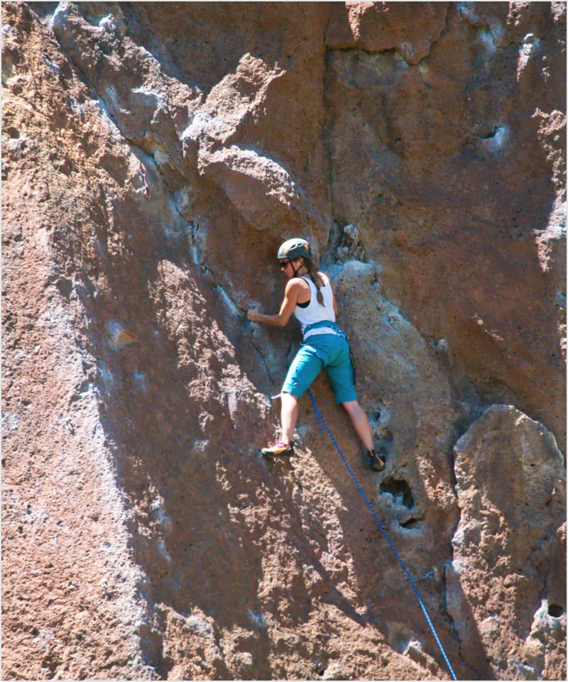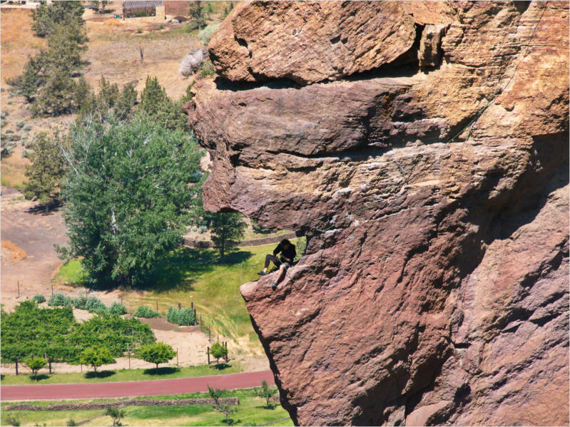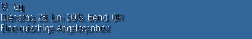 Obwohl ich heute gemütlich frühstückte, war ich schon um 7:38 Uhr auf der Straße. Bevor ich zum Smith Rock SP fuhr, legte ich noch eine kurze Shopping Runde bei Safeway ein. Meine Biervorräte neigten sich langsam dem Ende entgegen und ein Sandwich wollte ich auch noch mitnehmen. Getankt hatte ich schon gestern und so konnte es anschließend gleich losgehen.Um kurz vor 9:00 Uhr erreichte ich den Ich zahlte 5 $ am Automaten und stellte Red Beauty auf dem Parkplatz ab. So weit so gut. Einen Parkplatz hatte ich schon mal. Die Wanderschuhe waren geschnürt und der Rucksack gepackt. Da es inzwischen schon weit über 20 °C waren, füllte ich zu den Wasserflaschen noch meinen Wasserschlauch. Jetzt musste ich nur noch herausbekommen, wo der Trail beginnt, denn einen Parkplan hatte ich leider am Eingang nicht bekommen. Ein netter Jüngling mit Kletterequipment wies mir den Weg. Leider wies er mich nicht darauf hin, dass ein anderer Parkplatz für mich viel sinnvoller gewesen wäre, aber das wusste ich jetzt noch nicht. So kam es dann, dass ich erst einmal ein Stück des Rope-de-Dope Trails und ein weiteres Stück des Canyon Trails lief, bevor ich überhaupt an meinem eigentlichen Trail, dem ankam. Ich kam mir jetzt schon vor wie im Backofen und machte erst einmal an einer Bank mit einer Wasserstelle halt, bevor ich mich an den steilen Aufstieg machte. Hier kam ich dann mit einer Engländerin ins Gespräch, die am Fuße des Trails auf ihre Familie wartete. Sie war total entsetzt, dass ihre Landsleute für den Brexit abgestimmt hatten. Ich konnte es gut nachvollziehen. Keine Ahnung, wie es mit der Wirtschaft und den Banken danach weitergehen wird.Nachdem ich mich etwas ausgeruht hatte, machte ich mich auf den eigentlichen Weg. Es war inzwischen schon kurz vor 10:00 Uhr. Die Wanderung führte vom Misery-Ridge Trail zum Mesa Verde- und River-Trail.Der Aufstieg zur Missery Ridge hatte es schon einmal in sich. Ich kam ganz schön außer Puste und musste ab und an anhalten. Aber bei dieser Hitze ging es nicht schneller. Außerdem war der Weg recht rutschig. Dies wurde auch zwei Frauen zum Verhängnis. Sie rutschten beide aus und fielen hin. Eine hatte sich wohl ganz schön weg getan. Sie hatte nämlich nur eine kurze Shorts an und schürfte sich ihre Hinterseite auf. Außerdem entdeckte ich auf dem Trail auch noch dieses Monster: Oben angekommen drängelten sich alle unter das einzige Bäumchen, das hier stand, um etwas auszuruhen. Kein Wunder also, dass ich erst nach einer gehörigen Portion Schatten die schöne Aussicht bewunderte.Da es aber viel zu heiß auf dem Plateau war, schaute ich gleich, dass ich runter kam. Ich wollte endlich an den Fluss. Beim Abstieg kommt einem dann gleich das Affengesicht (Monkey Face) in den Blick. Wahnsinn, was die Jungs und Mädels sich alles trauen. Ich schaute den dreien eine ganze Weile zu, denn hier am Weg gab es ein schattiges Plätzchen. Ansonsten war der Abstieg nicht so schön, denn es war wieder sehr rutschig. Auch hier konnte ich zwei Personen (diesmal setzte sich ein Mann auf den Po) beim Ausrutschen beobachten. Die Frau kam bei ihrem Sturz dem Abgrund recht nahe. Mir blieb bald das Herz stehen. Ihr sicher auch. Sie schien sich aber nichts getan zu haben. Ich war auf jeden Fall recht froh, als ich die rutschigen Passagen hinter mir gelassen hatte. Im Flusstal gefiel es mir sowieso viel besser. Die Kontraste waren hier richtig klasse. Dieser dunkle Fluss mit seinen hellen Felsen und dazu das saftige grüne Gras. Einfach nur schön. Blöd war nur, dass ich so lange laufen musste, bis ich endlich ein schönes schattiges Fleckchen für eine Mittagspause fand. Diese genoss ich dann aber in vollen Zügen. Genau wie den restlichen Weg am Ufer des Croocked Rivers entlang. Was für eine schöne Landschaft. Mir graute es offen gesagt etwas vor dem Weg zurück zum Auto, denn dort würde es noch einmal heftig aufwärts gehen. Aber noch wanderte ich am River Trail entlang und genoss noch etwas die schöne Landschaft und die bunten Felsen.Wieder auf der anderen Seite der Brücke, legte ich erneut bei der Bank eine kurze Pause ein. Hier überlegte ich mir, wie ich am besten zurückkommen würde. Ich entschied mich, diesmal über den Rim Rock Trailzu laufen. Der Weg zog sich zwar etwas in die Länge, dafür hatte man meist schöne Ausblicke. Auf der Rückfahrt machte ich an der Juniper Junction noch eine kurze Eispause. Der Becher Huckleberry Ice Cream war wirklich sehr lecker.Insgesamt war ich heute zwar nur 5 Meilen gelaufen, diese hatten es allerdings in sich. Bei dieser Hitze brauche ich das nicht noch einmal. Ich weiß gar nicht mehr, wie wir das früher immer gemacht haben, bei solch hohen Temperaturen zu wandern. Echt irre.Ich war so verschwitzt, ich wollte nur noch unter die Dusche und fuhr daher nicht mehr zum Newberry Crater, sondern direkt Richtung Motel. Als ich dann aber eine Autowaschanlage entdeckte, machte ich noch schnell einen Einkehrschwung. Red Beauty war wirklich nur noch ein Schmutzelchen. Da ich gestern in einen Schwarm kleiner Mücken geraten war, klebten nicht nur Staub, sondern auch tausende toter Mücken an ihrem Lack. So gegen 15:00 Uhr war ich dann endlich zurück im Motel. Hier bin ich dann nicht an den Pool, denn dort war es einfach zu voll und das Wasser war eh zu warm. Ich stellte mich lieber gleich unter die Dusche und trödelte dann noch ein Stündchen herum. So gegen 17:00 Uhr machte ich mich dann wieder auf den Weg. Zuerst ging es zu Radio Shack. Hier wollte ich mir endlich noch ein paar von den kleinen Adaptern für die USA kaufen. Das habe ich schon seit Jahren vor. Ich liebe ja diese Elektrokette. Die Filialen sind zwar meist recht klein, die Mitarbeiter sind allerdings fast immer sehr kompetent und am Ende gehe ich mit etwas raus, das ich brauchen kann. So auch diesmal. Nachdem ich dies eingesackt hatte, bin ich noch schnell in eine Pharmacy, etwas für eine Freundin einkaufen. Leider gab es die gewünschte Creme nur auf Rezept 