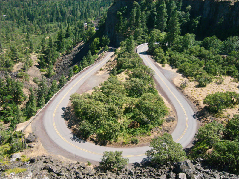Vom Aussichtspunkt Rowena Crest hat man einen schönen Blick auf den Columbia River und zurück auf die Straße, die