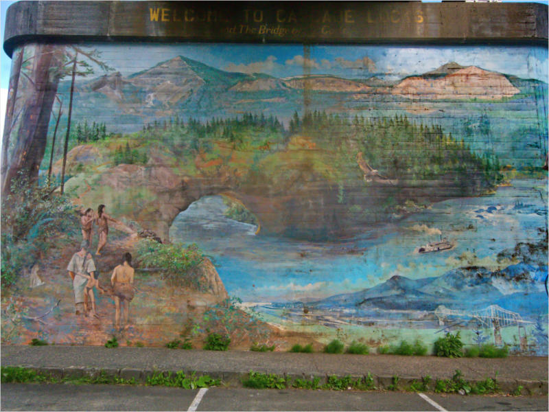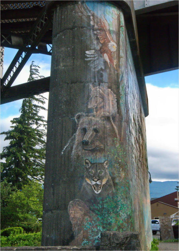 Blick auf das schon etwas verwitterte Mural am Brückenfeiler auf der Oregon-Seite.