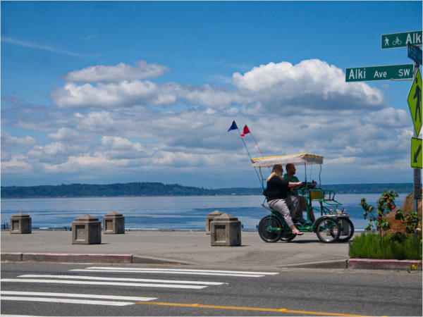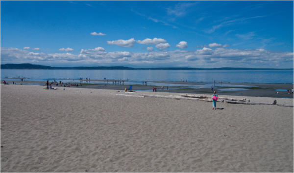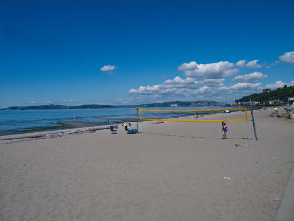 Blick vom Duke‘s auf den schönen breiten Strand am Alki Beach