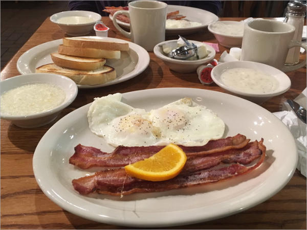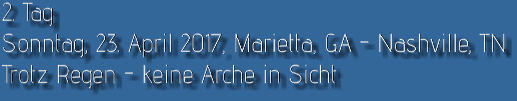 Die Nacht war kurz aber gut, die Koffer schon umgepackt und dem Frühstück bei Cracker Bell stand nichts mehr im Wege. Wir gönnten uns beide ein typisch amerikanisches Frühstück mit Spiegeleiern over medium, Bacon und Toast. Der Service war flott, die Eier auf dem Punkt und der Speck knusprig. Alles perfekt, so könnte es weiter gehen. Da es inzwischen hell geworden war, stand unserer Reise nun nichts mehr im Wege. Es konnte also losgehen mit der „Girls, just want to have fun Tour 2017!“Geplant war eigentlich, via Highway zum Little River Parkway zu fahren und dort zu den Wasserfällen zu spazieren. Das blöde Wetter (es regnete schon seit dem Frühstück in allen Variationen) machte uns da aber einen Strich durch die Rechnung und so fuhren wir auf direktem Wege über den Interstate nach Lynchburg. Hier wollten wir die Destillerie von Jack Daniels Whiskey besichtigen. Der Regen machte uns allerdings auch da einen Strich durch die Rechnung, denn obwohl wir direkt über den Interstate fuhren kamen wir durch die schlechten Wetterbedingungen nur sehr schlecht voran. Um uns herum rasten sie wie die Bekloppten und das teilweise bei null Sicht. Ich war inzwischen richtig froh, dass wir doch bei dem Grand Cherokee geblieben waren, denn seine erhöhte Sitzposition verschaffte mir ein besseres Sichtfeld über diese Regenschwaden. Die Fahrt zog sich wie ein Kaugummi. Dann sahen wir auch noch einen recht üblen Unfall. Kein Wunder bei dieser Raserei. Ein PKW hatte bei schlechter Sicht wohl eine Kurve übersehen und war im hohen Bogen über die Leitplanke und die entgegen kommende Fahrbahn geschossen und in den Bäumen gelandet. Man kann nur hoffen, dass die Bäume den Aufprall etwas gemindert hatten und die Insassen noch lebend geborgen werden konnten. Da wir kurz hinter dem Unfall an der Unfallstelle vorbei kamen, hatten wir keinen Stau. Im Rückspiegel konnte ich sehen, dass sich der Verkehr inzwischen kilometerlang hinzog. Obwohl wir ja recht früh losgefahren waren, brauchten wir eine kleine Ewigkeit bis Lynchburg. Nachdem wir geparkt und uns orientiert hatten, war es schon 13:00 Uhr bis wir an der Kasse von Jack Daniels Distillery ankamen. Dort erfuhren wir, dass die nächste Tour erst 40 Min. später starten würde. Wir beide kannten solche Führungen bereits. Da wir keine Lust hatten, die Zeit dort zu vertrödeln (so dolle war das Wetter ja immer noch nicht), ließen wir die Führung durch die Distillery sausen und spazierten einfach etwas durch Der Spaziergang durch Lynchburg war genau das Richtige, um sich mal die Beine zu vertreten. Ein ½ Stündchen später waren wir dann schon auf dem Weg nach Nashville. Trotz des schlechten Wetters verzichteten wir darauf auf den Highway zu fahren. Noch hofften wir, dass sich das Wetter bessern würde. Während unserer Fahrt über den HW 82 passierten wir mehrere kleinere Gehöfte und Ortschaften. Insgesamt war die Fahrt recht ereignislos. Als wir dann in Shelbyville direkt an einem kleinen alten Friedhof vorbei fuhren hielten wir für einen kurzen Fotostopp..Leider fing es während unserer Tour über den Cowan Cemetery wieder an zu regnen. Wir beeilten uns daher zurück ins Auto zu kommen. Gerne hätten wir auch noch das größere Gräberfeld besichtigt, aber der Regen wurde immer heftiger.Zurück im Auto entschieden wir uns, den Higway zu verlassen und bei der nächsten Gelegenheit auf den Interstate zu wechseln. Bei diesem Wetter machte das Fahren über die Dörfer keinen Spaß. Kurz bevor wir Nashville erreichten entschieden wir uns, den eigentlich geplanten Besuch der Gräber von Johnny Cash und June Carter Cash zu canceln, den es schüttete mal wieder wie aus Eimern. Wir fuhren lieber ohne Umwege in unser Hotel in Unser Hotel erreichten wir gegen 15:00 Uhr. Nach einem flotten Check-in bezogen wir gleich unser schönes Zimmer für zwei Nächte. Gabi fielen sofort die Zierkissen mit Gitarren auf. Na das passte! Auf dem Tisch entdeckten wir dann noch ein Willkommens-Tütchen, über dessen Inhalt wir uns gleichzeitig mit einem ersten Sundowner-Bierchen her machten. Frisch geduscht liefen wir dann gegen 16:30 Uhr durch Nieselregen gen Downtown zum Broadway, der zum Glück nur 10 Min. vom Hotel entfernt war. Hier wollten wir dann gleich etwas zu essen jagen, denn bis auf das Frühstück hatten wir heute noch nix gegessen.. Gabi schimpfte auf dem Weg wie ein Rohrspatz. Sie ärgerte sich, dass wir keinen Regenschirm dabei hatten, denn unsere Regenjacken boten natürlich nicht genug Schutz vor dem Regen und außerdem kamen immer wieder Spritzer auf ihre Brille. Da ist sie echt empfindlich. Da ich meine Brille abnehmen kann, ist das für mich nicht so ein Problem, für Gabi halt schon. Das von Andrè und Hannaleena empfohlene Restaurant (Jack's Bar-B-Que) war dann zum Glück gleich am Anfang vom Broadway. Wegen dem blöden Wetter gab es zumindest keine Schlange. So war der Regen wenigstens für eins gut. Zu essen gab es dann irgendwas mit Pulledpork. War richtig lecker!!! Der einzige Wehmutstropfen war, dass es keinen Coleslaw mehr gab. Außerdem war es in der Bude saumäßig kalt. Ich schätze mal, dort habe ich mir gleich ne Erkältung geholt, denn wir beiden Hasenhirne hatten zwar unsere Regenjacken angezogen, hatten aber die Fleece rausgenommen, da die Außentemperaturen ja trotz Regen noch recht angenehm waren. Allerdings hatten wir total aus dem Blick verloren, dass die Amis ja alles immer so runterkühlen.Nach dem Essen sind wir dann rüber zu Tootsies. Da war schon die Hölle los. Die Band spielte Crossover und die Stimmung war am Kochen. Allerdings war es so voll in dem kleinen Schuppen und der Alkoholpegel hing schon so hoch, dass wir nicht mitkamen. Dafür hatten wir wohl doch noch zu sehr den Jetlag in den Knochen. Wir sind dann ein Haus weiter. Mehr wäre auch bei diesem Regen nicht gegangen. Im Legends Corner war ebenfalls gute Stimmung. Allerdings war hier weitaus mehr Platz, bzw. bekamen wir zwei gute Stehplätze am Tresen und hatten