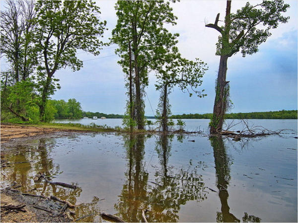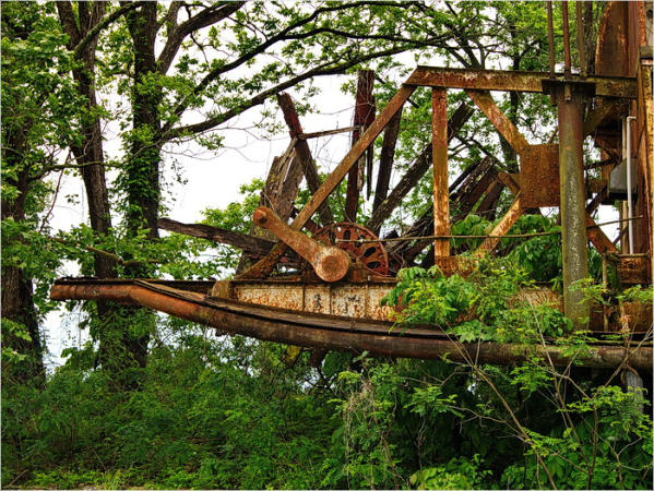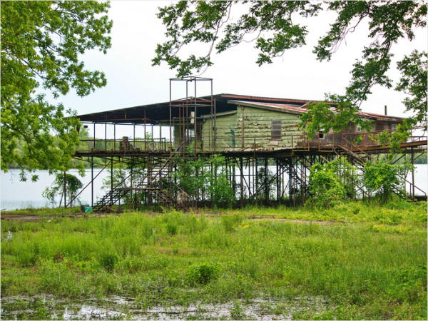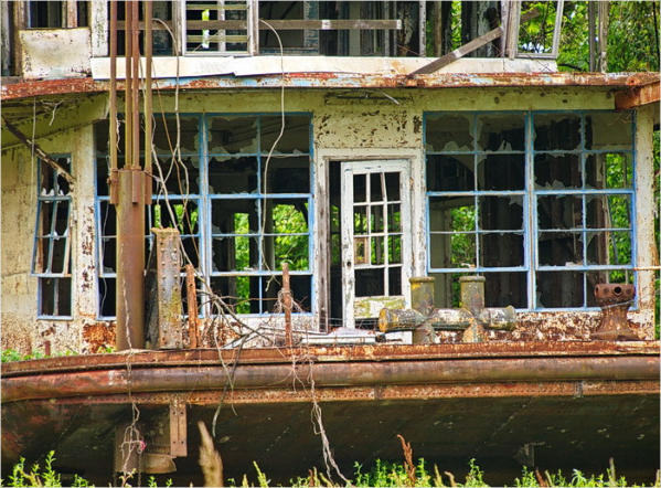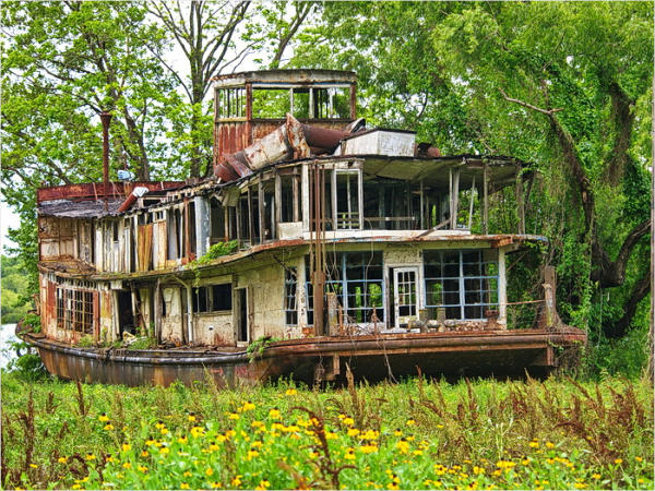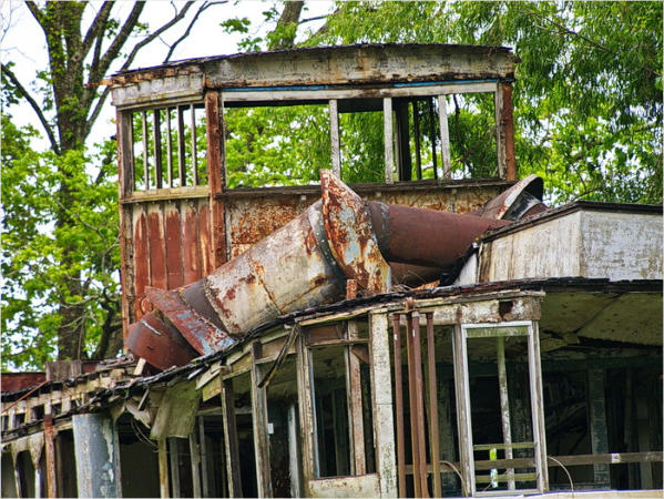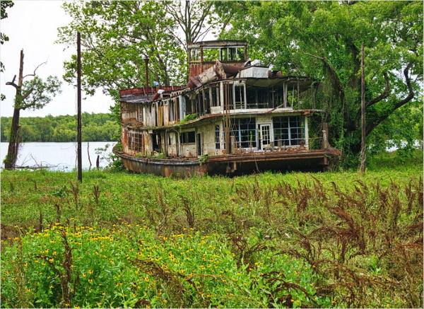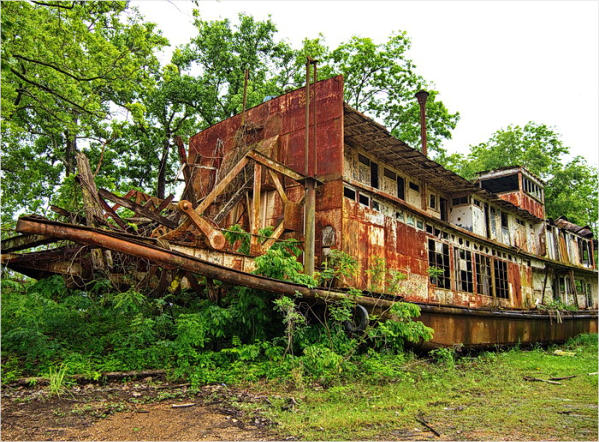 Der Schaufelraddampfer Marnie S. Barrettfand hier sozusagen seine letzte Ruhestätte. Gebaut wurde das Riverboat 1921 in Jeffersonville, Indiana, und wenn er reden könnte, dann hätte er wohl eine ganze Menge zu erzählen. Marnie wechselte nicht nur die Besitzer, sondern auch den Namen und war zeitweise sogar in Besitz der US Marine. Letztendlich schaffte es die alte Dame 1990 ins National Register of Historic Places. Dies war auch die Zeit, wo der Dampfer zum letzten Mal umgebaut wurde. Diesmal zu einem Casino-Schiff. Doch bevor überhaupt jemand darauf spielen konnte, wurde das Schiff bei der großen Flut von 1993 in den Seitenarm des Mississippi gedrängt und strandete hier. Wer mehr über das Schicksal dieses Raddampfers wissen möchte, kann hier nachschauen.