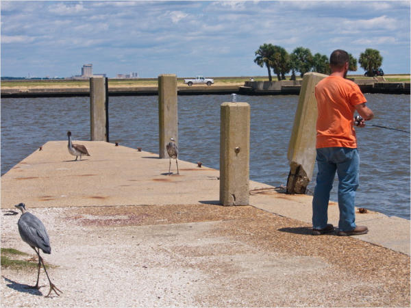 Schauspiel. Mehrere Reiher und ein Pelikan umlagerten einen Angler und hofften wohl auf einen Anteil vom Fang.