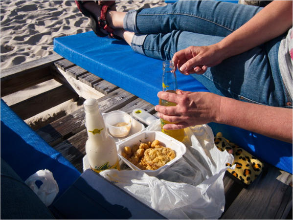 Picknick unserer Reste von gestern Abend (Grüne Tomaten und Popkornshrimps). So könnte es nachmittags immer