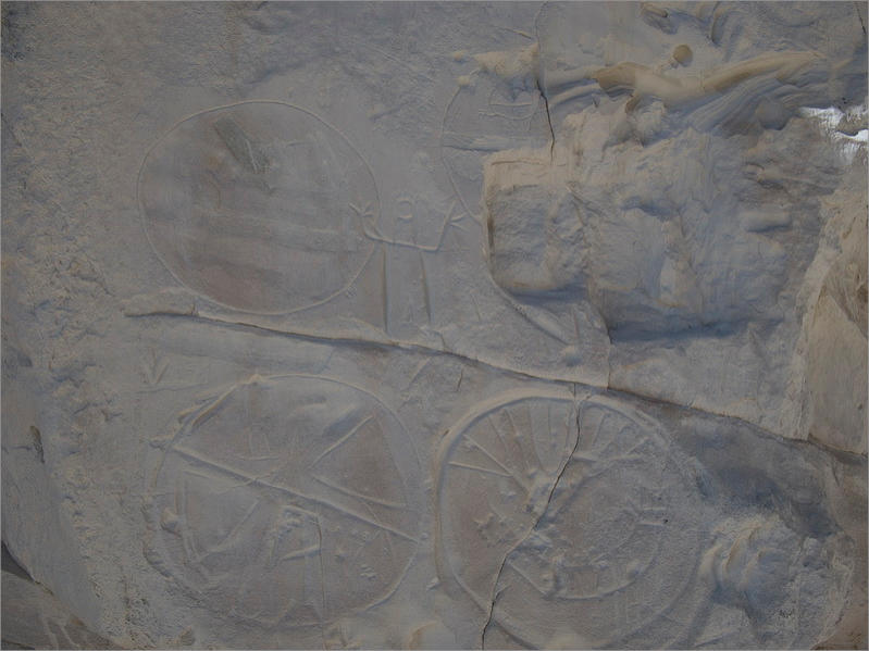 weichen Sandstein hinterlassen. Die Glyphen enthalten Bilder von Wasserschildkröten und kreisförmigen
