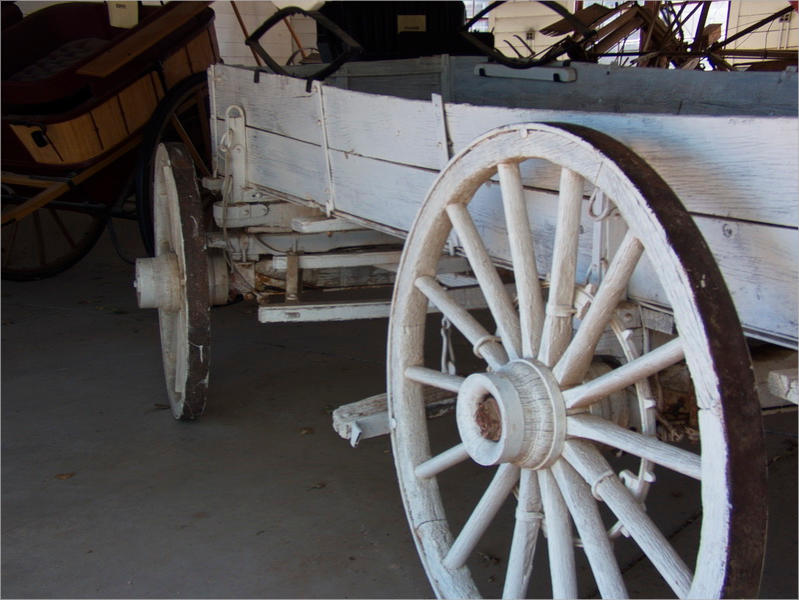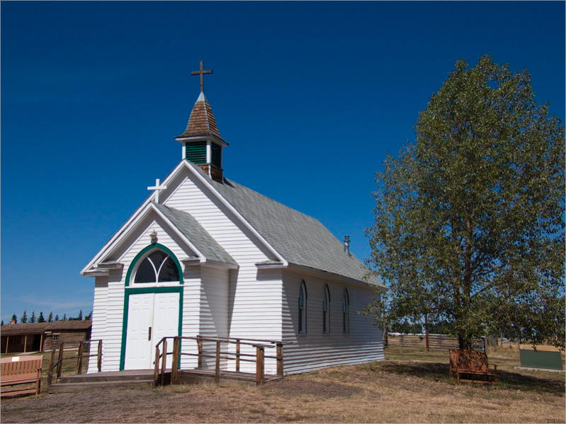 Kirche, Ställe, ein Ranchgebäude und eine nachgebaute Häuserzeile einer Kleinstadt, so um die Jahrhundertwende.